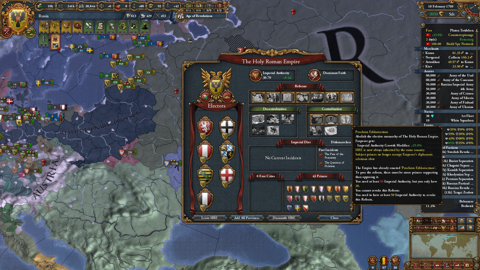 사실 프스코프는 여기서 끝냈어도 되었는데, 한 가지 업적이 더 있길래 군주정으로 변환하고 더 진행해봤습니다.