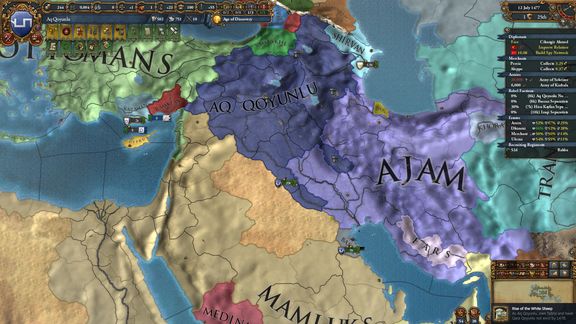 Rise of the White Sheep 업적은 AQ로 1478년까지 타브리즈를 장악하고 QQ를 멸망시키면 달성 가능합니다.