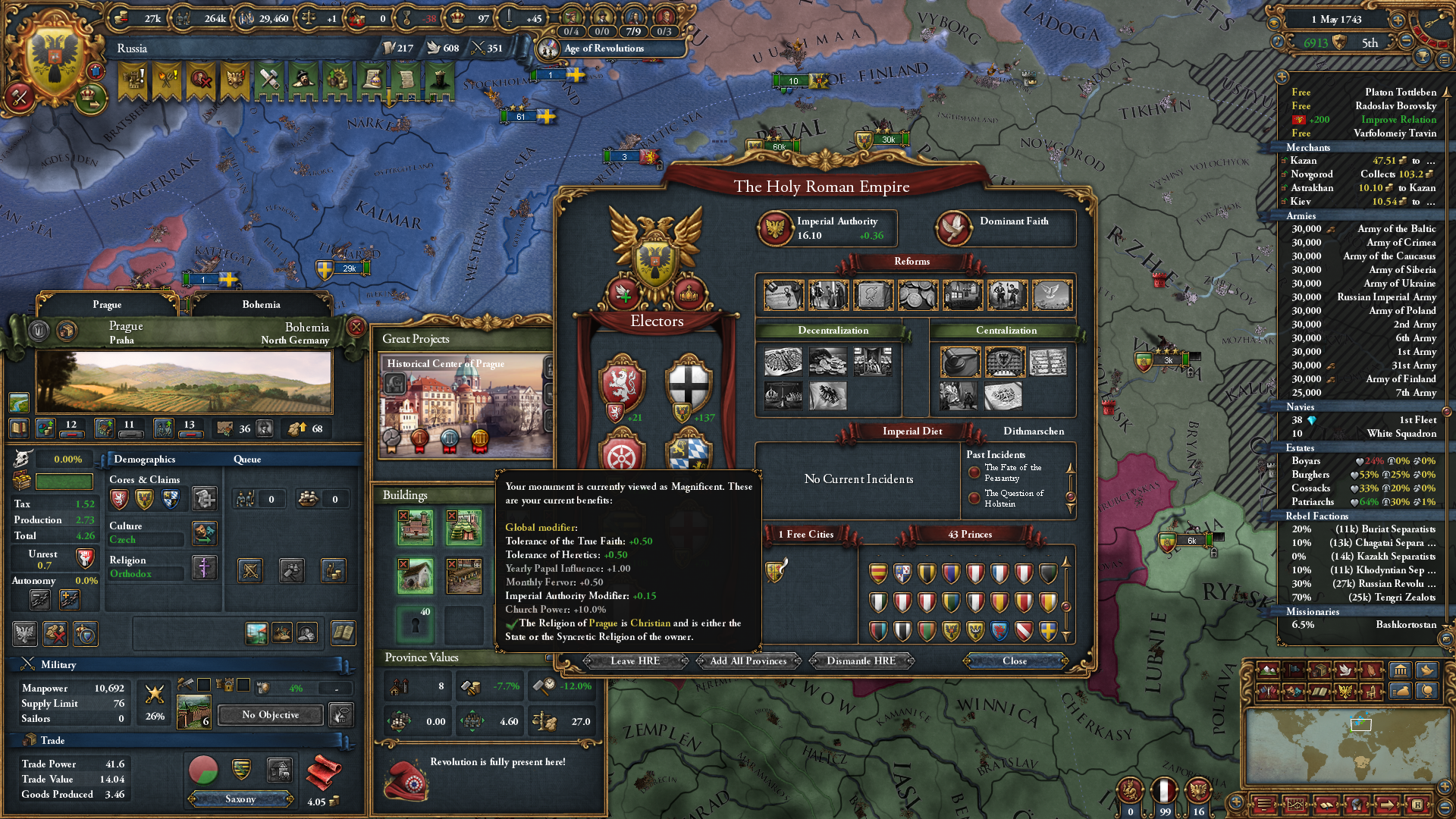이후 신롬 국가들 강제 개종 + 프라하 기념물 효과로 신롬 개혁을 쭉쭉 진행. 사실 프라하에 저 기념물 없었으면 신롬 개혁은 엄두도 못 냈을 듯;;; 신롬 황제에게 있어서 저 기념물은 OP 수준이더군요.