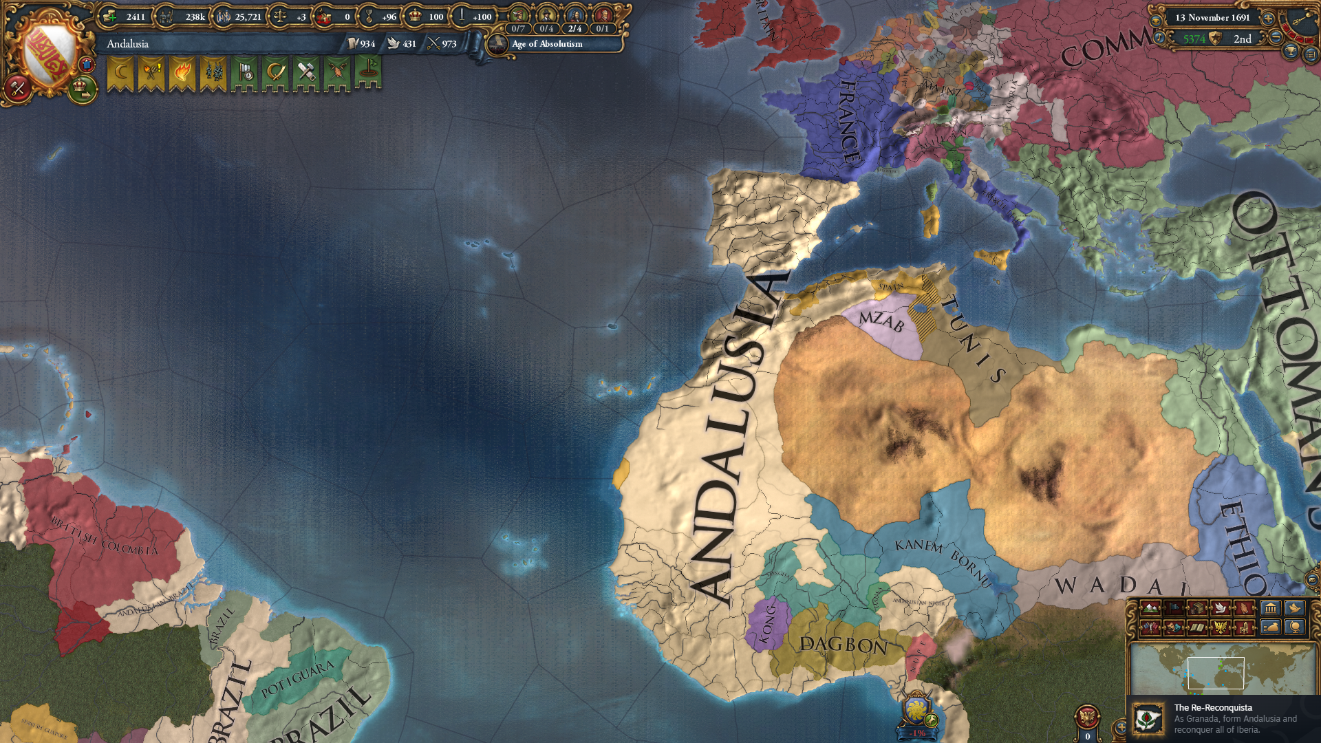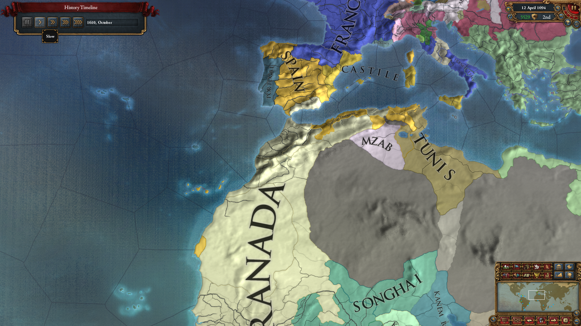 프랑스가 이베리아 북부를 먹어서 좀 귀찮아졌지만 체급이 큰 이후라 무리 없이 업적을 달성할 수 있었습니다. 시간 제한이 없는 업적들은 권토중래가 가능하다보니, 의지만 있으면 충분히 깰 수 있지요.