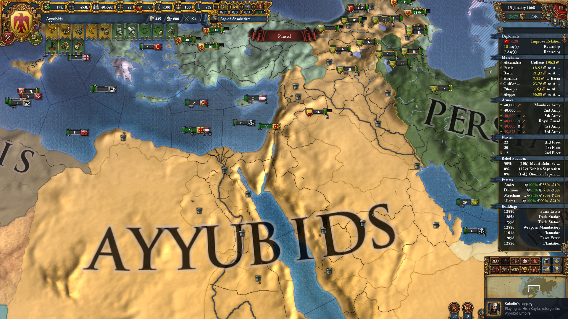 Saladin’s Legacy는 위의 지도에 해당하는 땅들을 먹으면 됩니다. 굳이 아이유브로 변화할 필요는 없고...