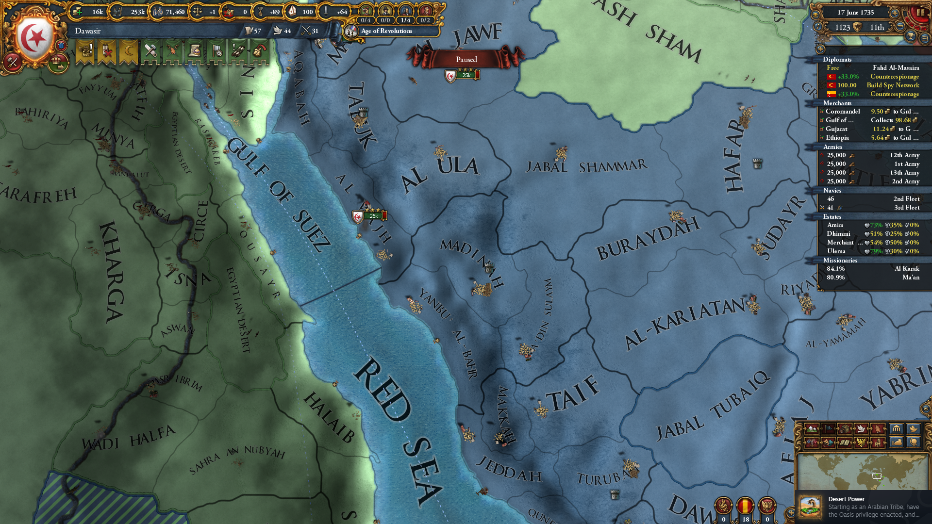저는 예멘하고 그나마 가까이 위치한 다와시르로 플레이했습니다. 예멘 쪽 및 아라비아 남부 해안가 지역이 그나마 번영한 편이라... 만약 지하드(나지드로 수니파 지역 500곳 이상 장악하기) 업적을 깨지 못했다면 나지드로 하는 게 가장 좋겠죠.