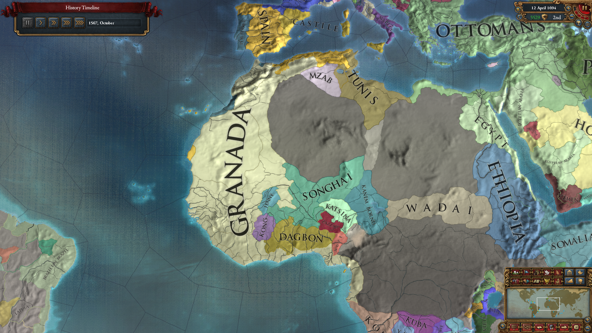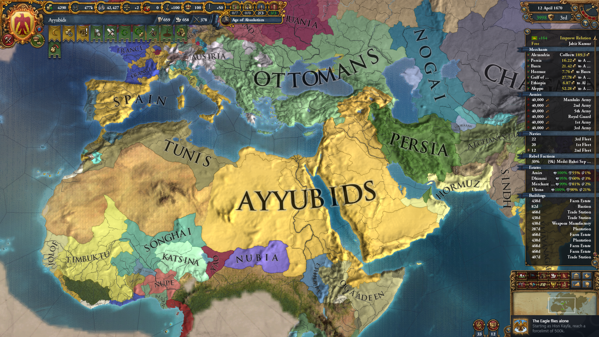 OPM 시작인 게 문제긴 한데, 오스만 혹은 맘루크 중 하나를 동맹으로 가져가고 아잠도 동맹으로 끌어들이면 AQ와 QQ 정도는 쉽게 제압이 가능합니다. 이후 맘루크 쪽으로 쭉쭉 나아가면 되죠.