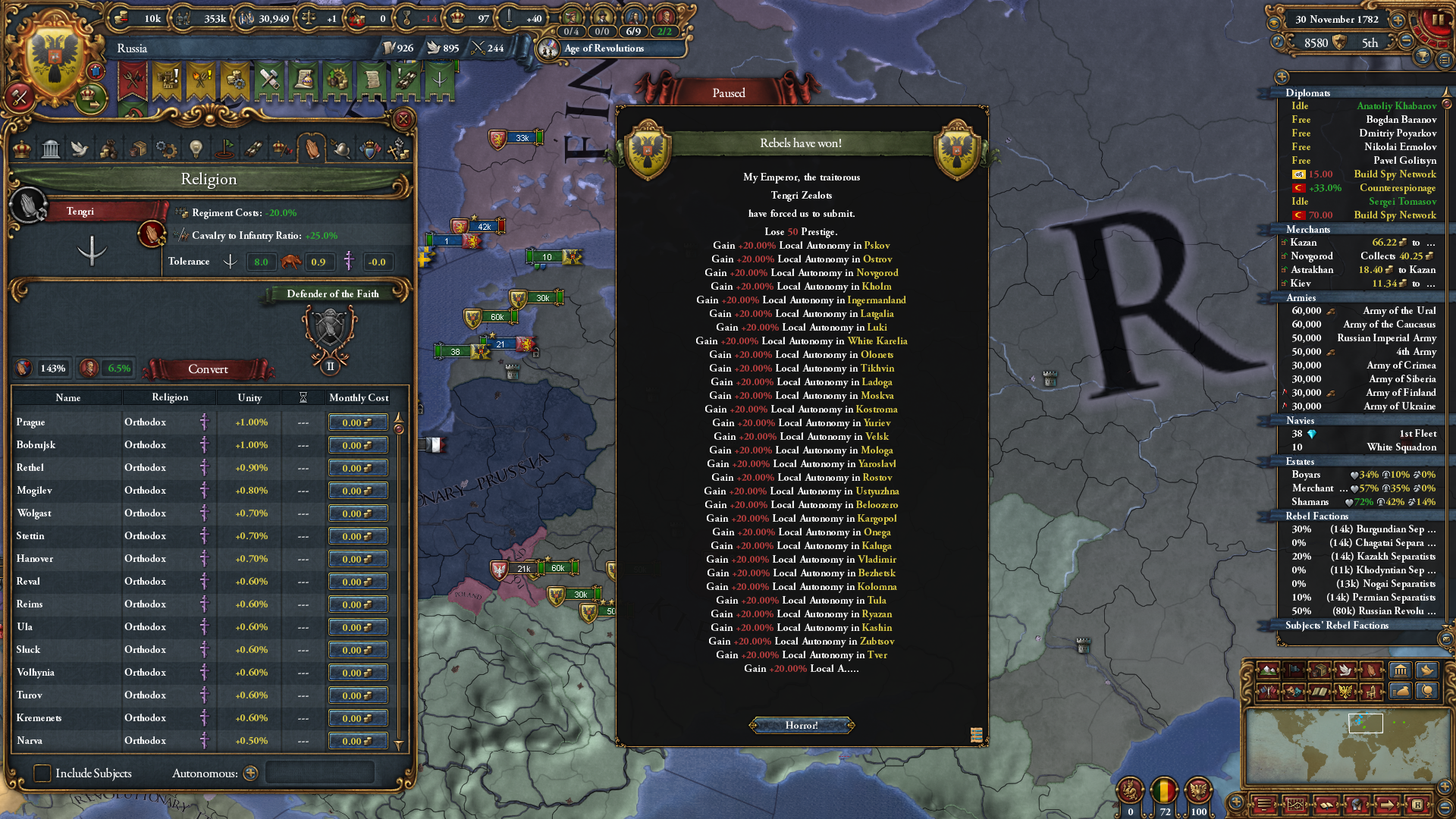 먼저 천명을 가져오려면 국교가 이교 계열에 속하거나 동방 계열에 속해야 됩니다. 러시아 입장에선 텡그리가 가장 편한 선택지긴 한데... 그것도 시베리아 쪽에서 받아와야하는 것이다보니 한참 걸립니다. 다행인 점은 천자가 되고 나면 국교를 변경해도 천자 자리를 잃지 않는다는 것.