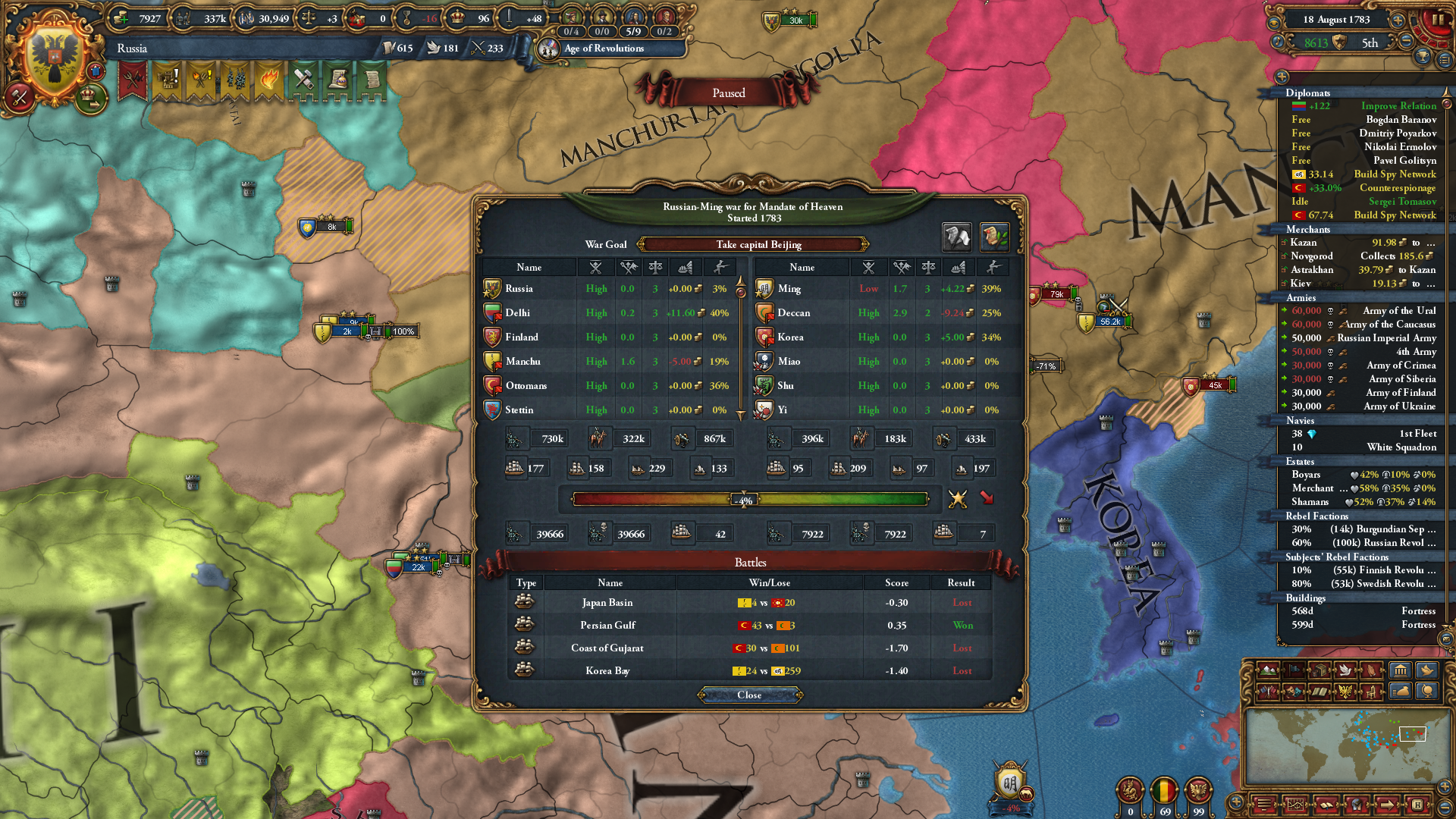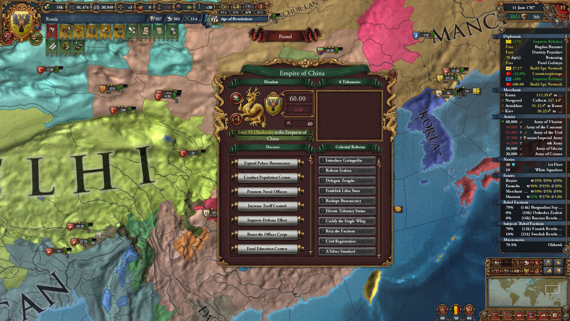 그러므로 천자 자리를 얻은 후 -> 기독교 계열로 개종 -> 신롬 황제가 되는 것이 편한 길입니다. 아니면 영구 세습 개혁까지 해야하는 데 시간이 오래 걸리죠; 관련해 Eu4 위키에서는 오이라트(* 국교가 텡그리)로 시작 -> 러시아 형성 -> 천명 뺏기 -> 천주교로 개종 후 신롬 황제 당선 쪽으로 가이드를 해주고 있습니다.