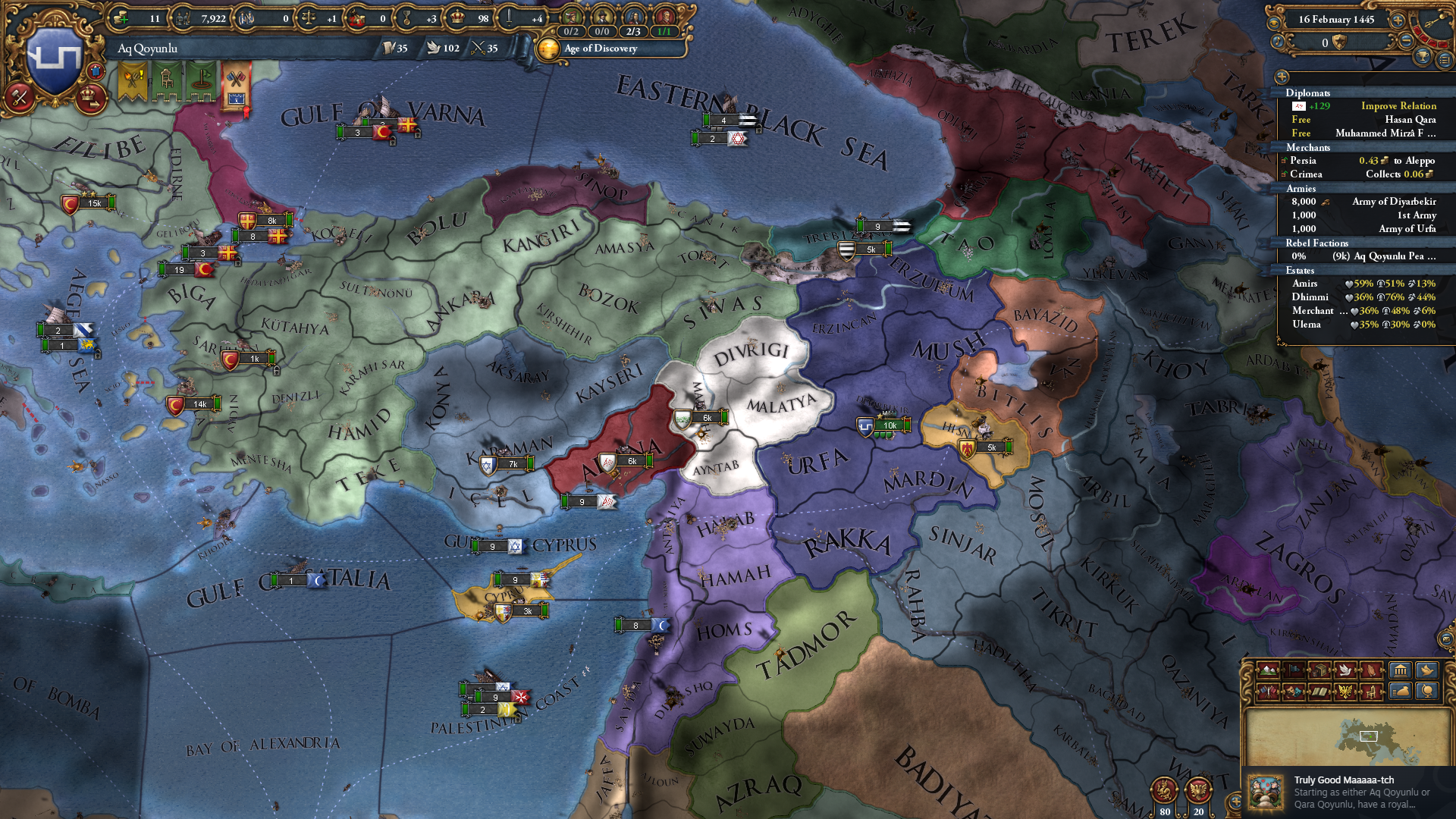 Truly Good Maaaaa-tch의 경우 QQ도 가능한데, 라마잔이 수니파다 보니 AQ로 하는 게 더 쉽습니다. 스크린샷에서도 보이지만 1445년 2월만에 달성한 것을 확인 가능(...) 두 번째 업적은 QQ를 상대로 3번 정도 전쟁을 해야 하는데, 오스만 혹은 맘루크, 그리고 아잠을 이용하면 QQ 상대하는 건 크게 어렵지 않습니다. 휴전 기간이 문제될 수 있는데, 동맹 돌려치기 후 화이트피스로 휴전 쿨 줄이기 같은 방법을 동원하면 되고, 정 안 되면 휴전 파기하고 패도 됩니다.