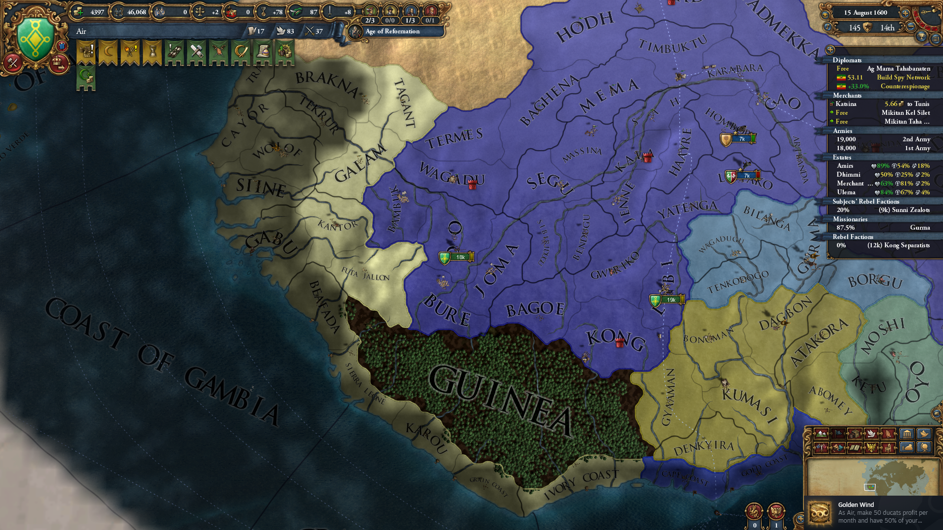 아이르라는 국가 자체가 컨텐츠가 부족해서(서아프리카 공용 임무 중점 + 수니파), 그렇게 흥미로운 업적은 아니었습니다. 업적 조건에서 수입 50%가 황금에서 나와야하다보니, 최소 황금 수입이 25 이상은 나와야 한다는 것인데... 황금 나오는 지역이 서아프리카 내에서는 3곳 밖에 없어 모로코 쪽의 황금 1개를 장악하거나, 에티오피아 쪽의 황금 생산지를 장악하는 쪽이 속 편합니다. 업적 조건이 저런데도 황금 관련 계층 특권이나 임무 보상이 있지도 않고... 재미없는 업적 중 하나.