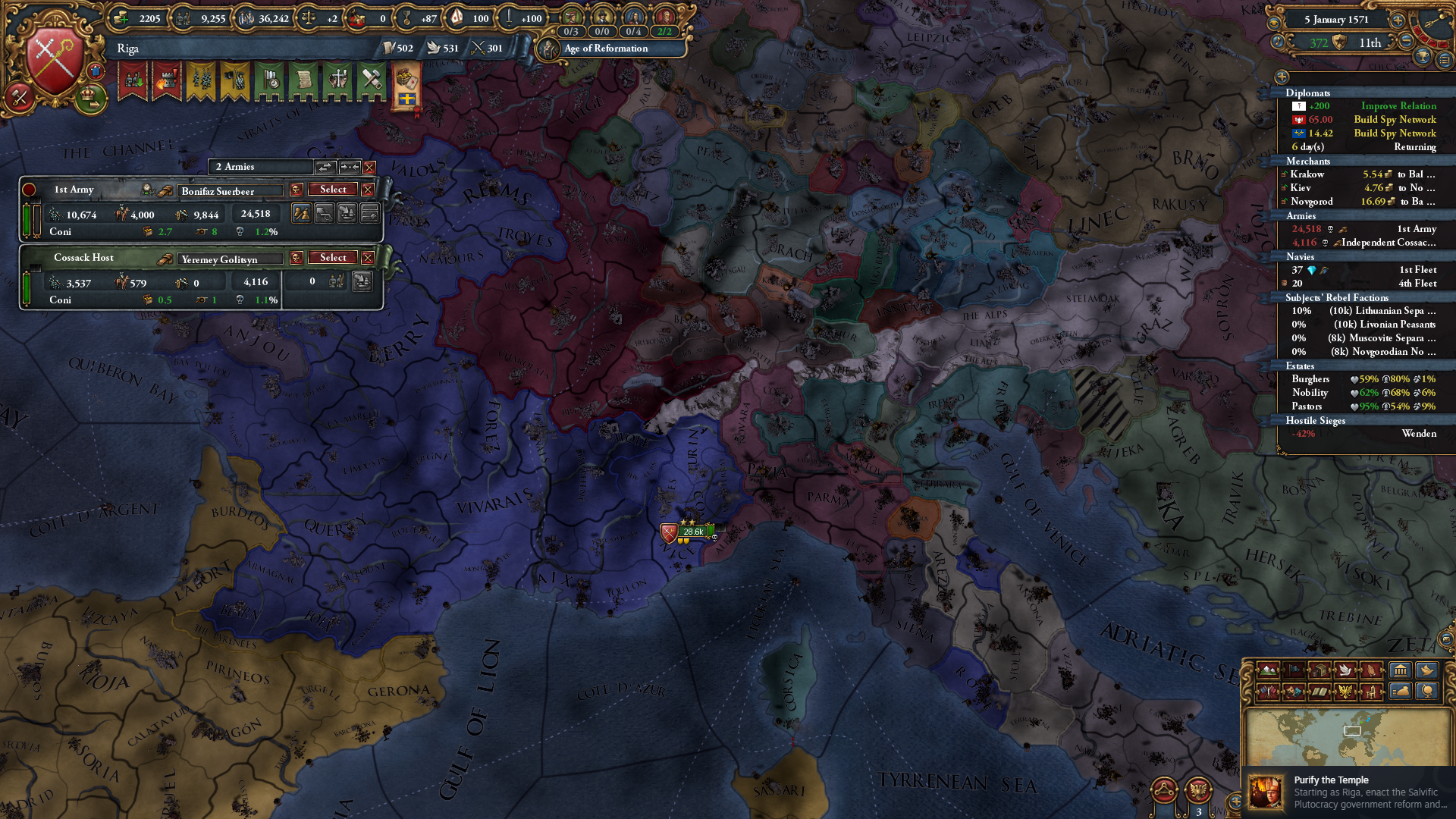 Purify the Temple 업적은 리가 고유 정부 채택 후, 로마를 가진 국가를 상대로 이단의 교회 약탈 평화 협상 조건을 요구하면 달성 가능합니다. 이 판에서는 프랑스가 로마를 낼름하는 바람에 프랑스를 패게 된 모습;