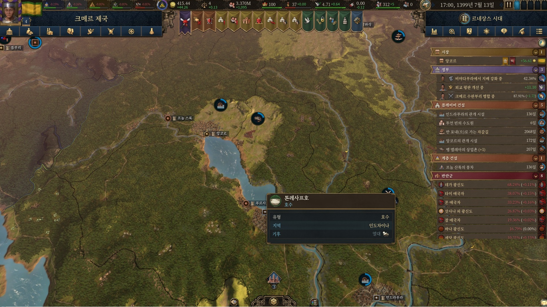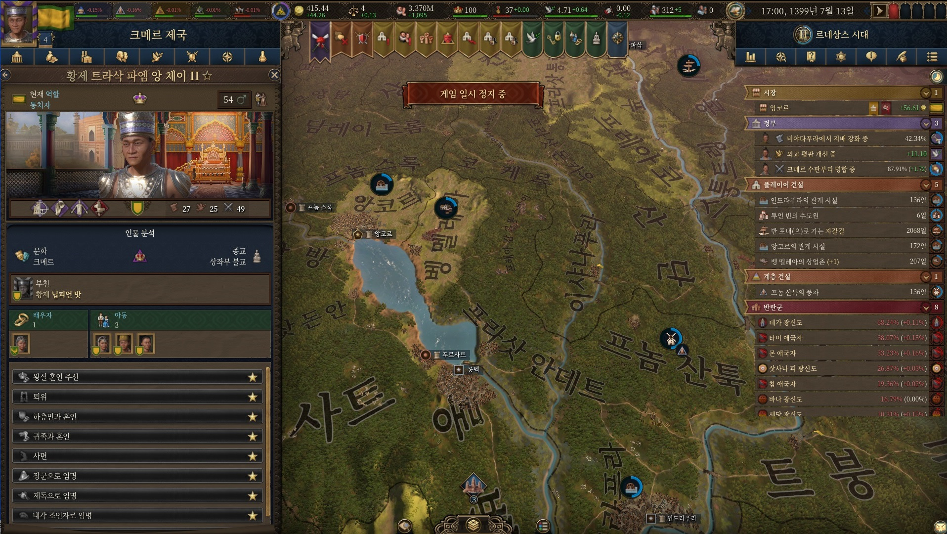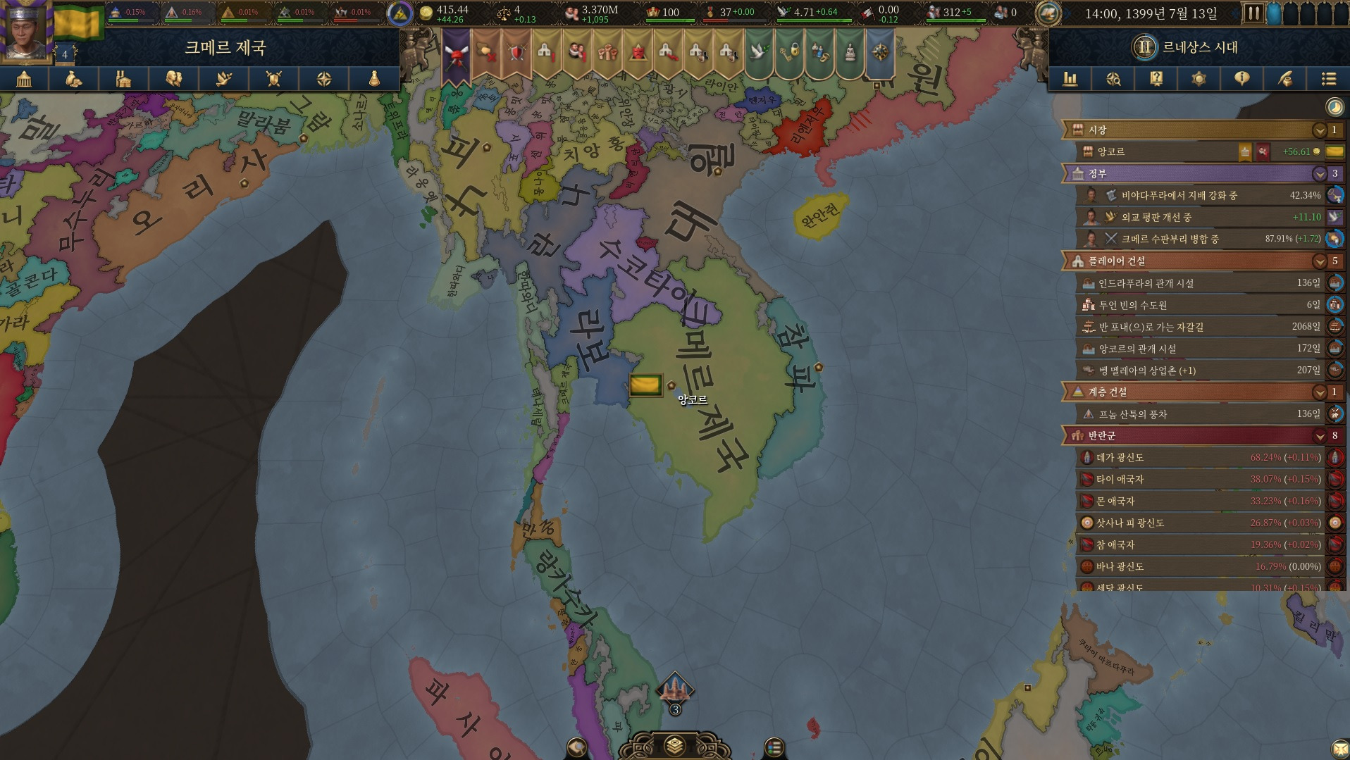 아무튼 꽤 재밌었습니다 크메르로 겨우 내정 잘 다듬고 하고 있는데 근데 그놈의 군대 뽑는거나 배를 만들지를 못해서 계속 애먹고 있네요