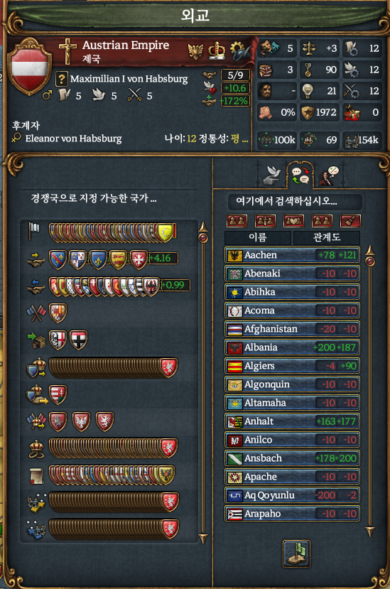 나름 관리된 독일의 제후국들+프랑스, 오스만, 스칸디나비아까지 조각나서 소국들이 여럿 존재하는걸로 플레이어가 신롬 황제구나 -> 부르고뉴 수도를 오스트리아가 먹어서 부르고뉴의 신롬 가입+몰타섬을 오스트리아가 먹튀(몰타를 참아?!)+오스트리아가 헝가리를 키움.... 으로 요약할 수 있으려나요.