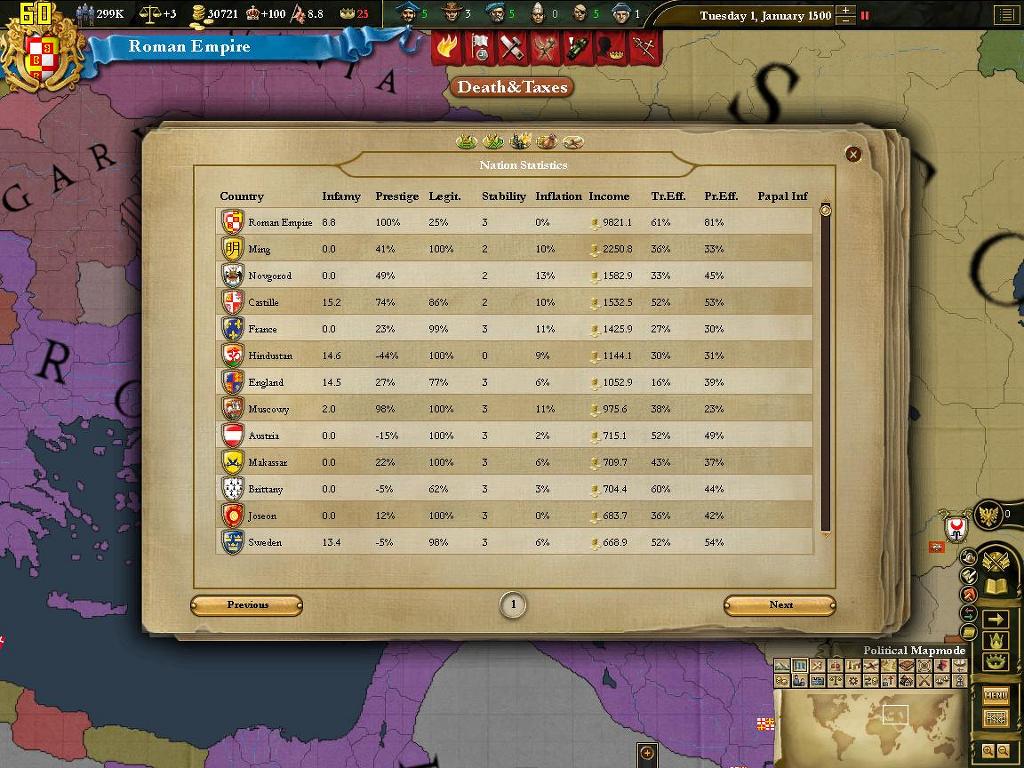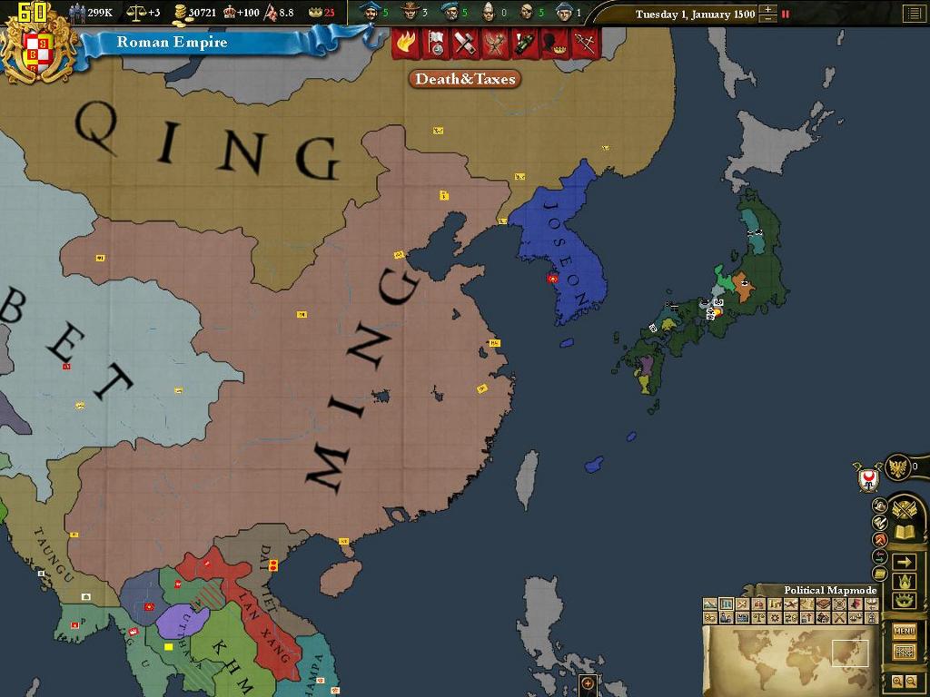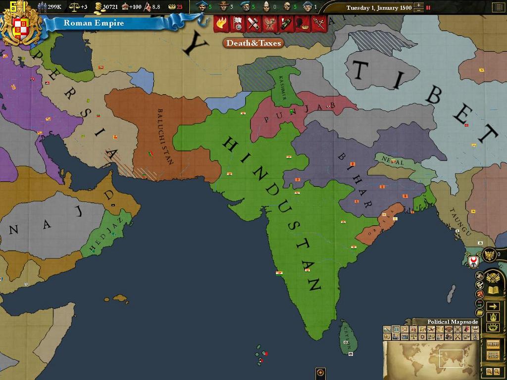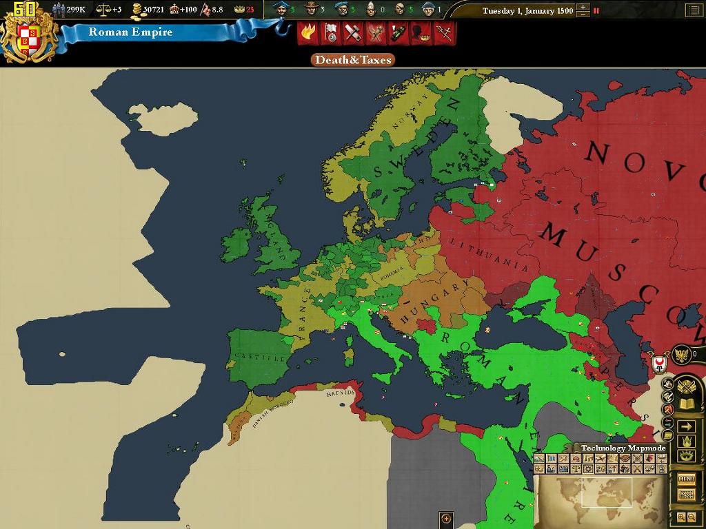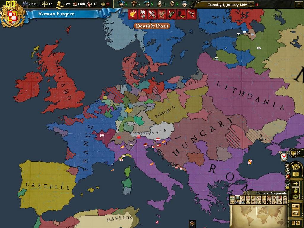 때는 1500년 1월 1일. 빛잔치움은 로마를 찍고[깃발은 그대로!] 생긴 코어지역으로 재정복을 대충 마쳤습니다.