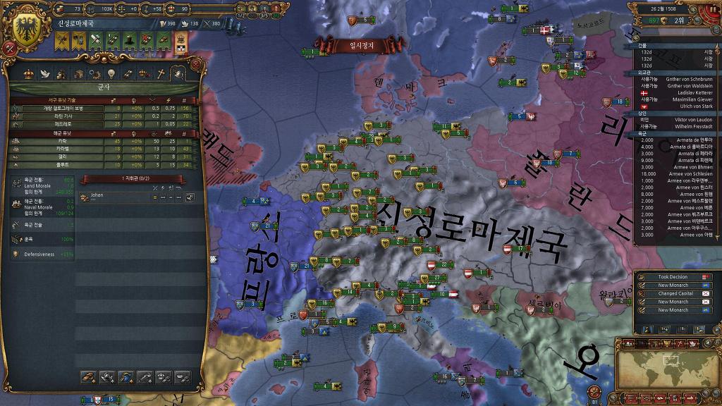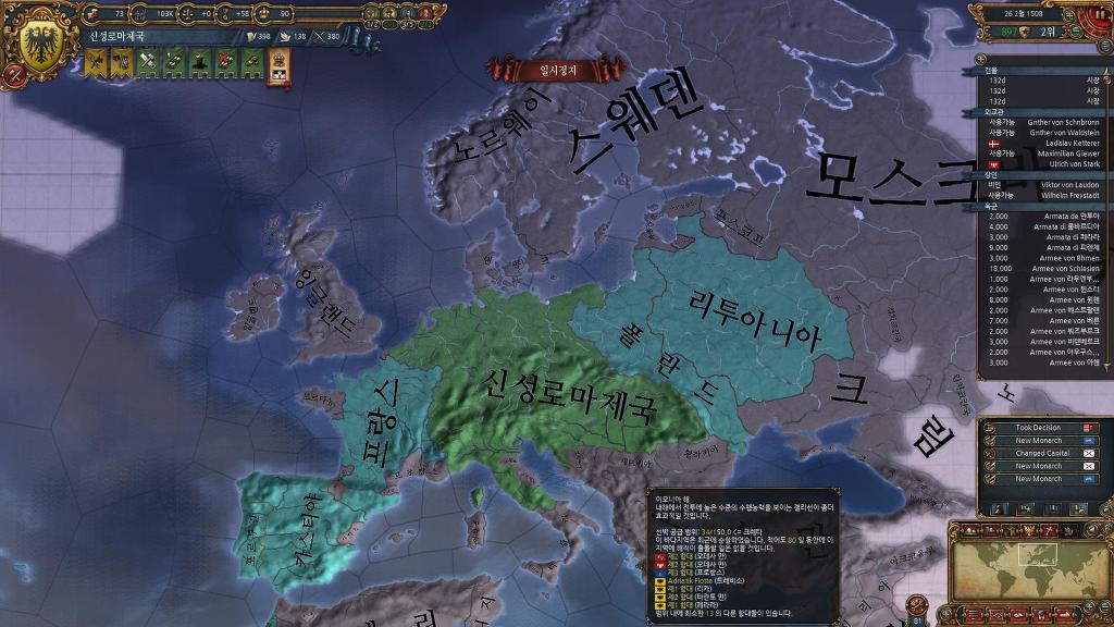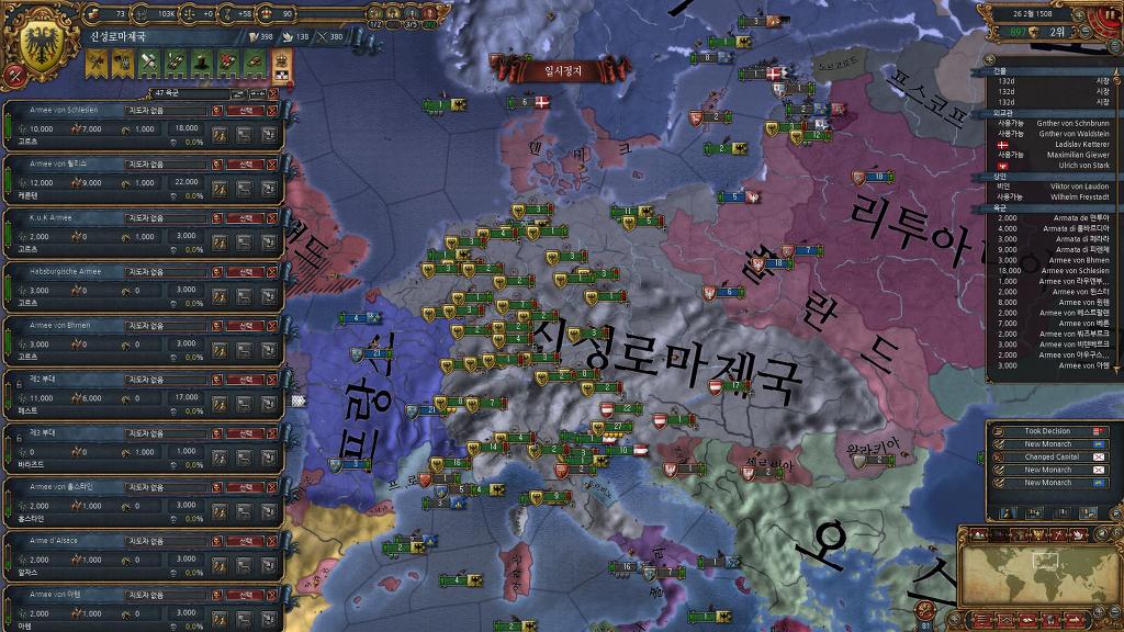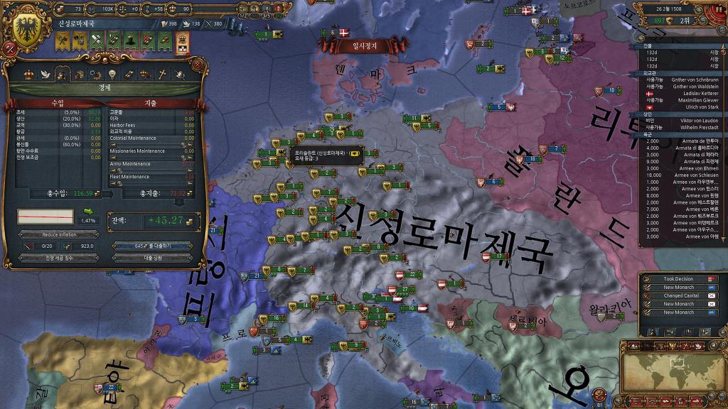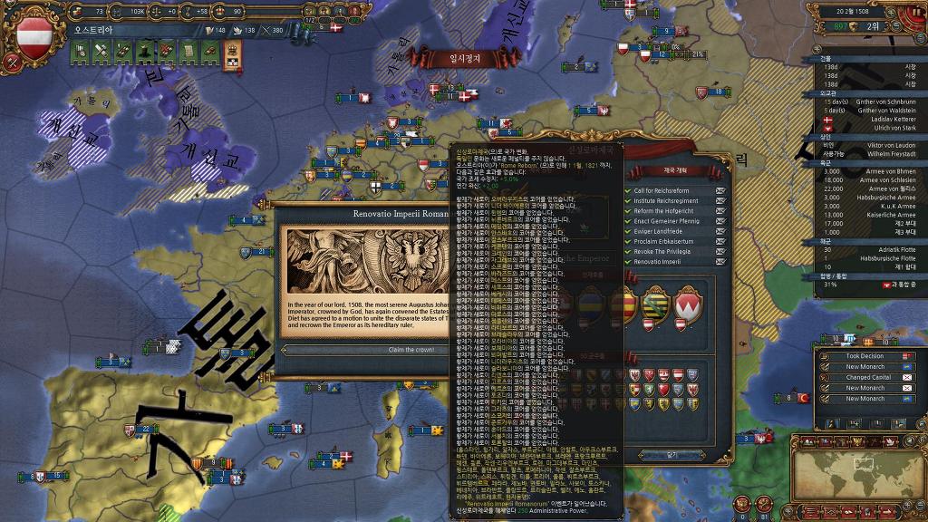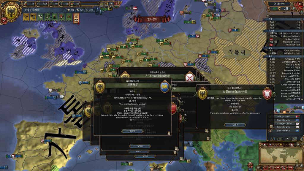 신성로마제국편입> 이벤트로 상속받은 브루군디에 땅 4개 신성로마제국 편입. 대략 권위 20~25 모음