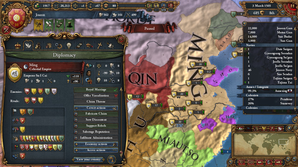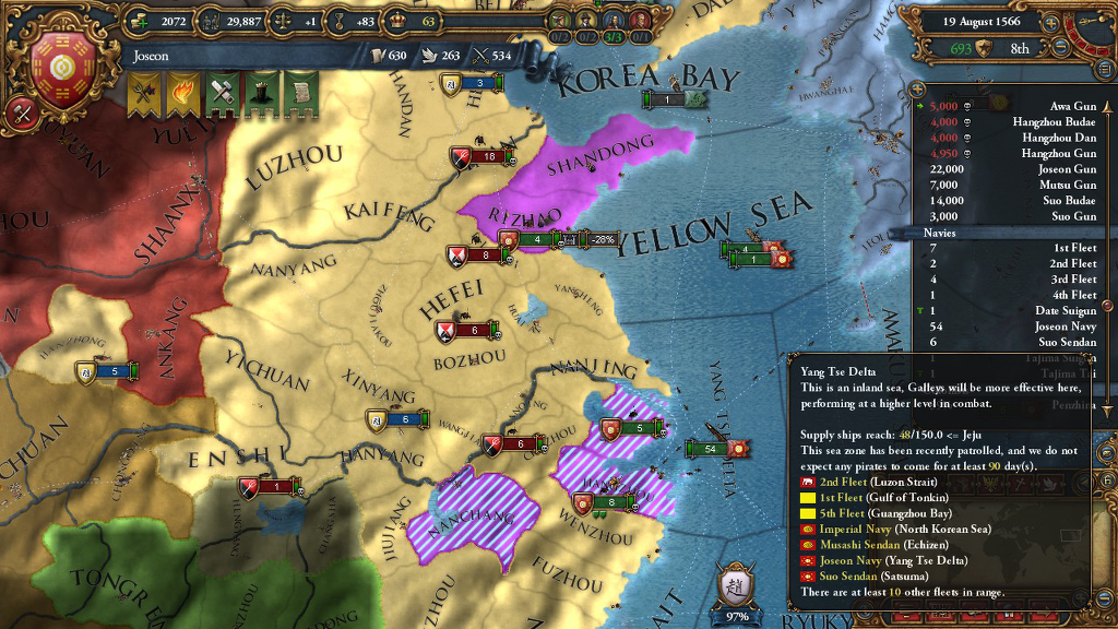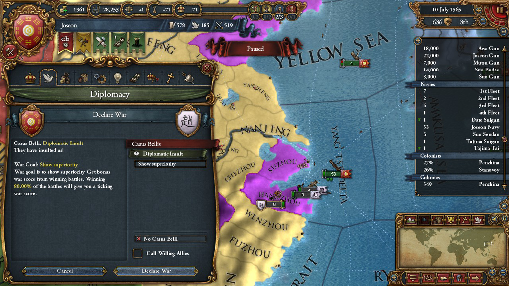 류큐 병합도 끝났으니 이제 중화 진출을 시작합시다. 명나라는 앞으로 지속적으로 반군에 의하여 털려나갈텐데, 반군들이 조나라에게 명의 영토들을 갖다 바치기 시작하면 국력이 역전되는 것은 금방입니다. 이번 전쟁에서 곧장 조나라를 병합할 수 있으면 좋을텐데요.