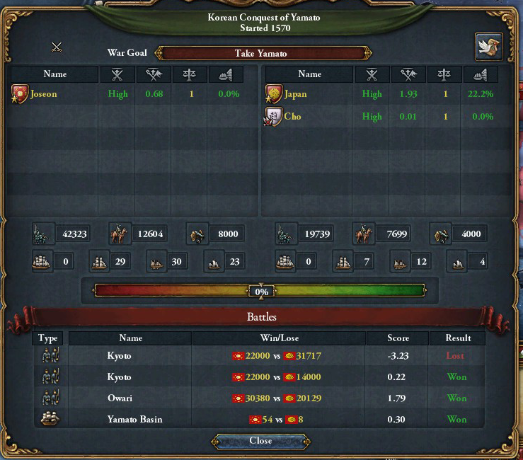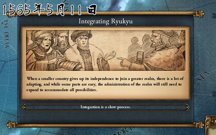 역시 병합은 실패, 3개 프로빈스를 받아냅니다. 참으로 애미리스한게, 프로빈스 전체를 다 먹어도 병합을 할 수 없는 국가들이 너무 많습니다. 지금까지 연대기를 쓰면서 세번 즈음 지적하는 문제인데, 전 국토를 다 점령당한 상황이라면 무슨 명령을 하던 다 받아주고 그래야 하는거 아닌가요? EU4의 시스템상이라면 도요토미 히데요시가 조선 정벌을 위해 조선을 침공해서 조선 전역을 다 점령하더라도 승리점수 때문에 조선을 병합하지 못하게 되고 그런다는 겁니다. 이순신이고 곽재우고 권율이고 다 필요가 없어요. 승리점수가 모자라서 조선은 병합을 안 당하거든요! 만세!
