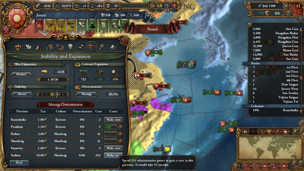 그리고 여담인데, 무슨 저 빌어먹을 짜장 땅은 땅 하나 코어 박는데 행정 포인트가 333씩이나 쳐드시나요. 중국 전역을 모조리 정벌하고 코어 한 번 박으려면 행정 포인트를 1만쯔음은 들이부어야 할 것 같습니다.