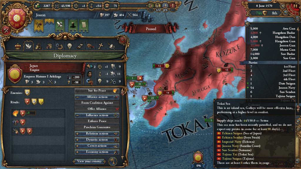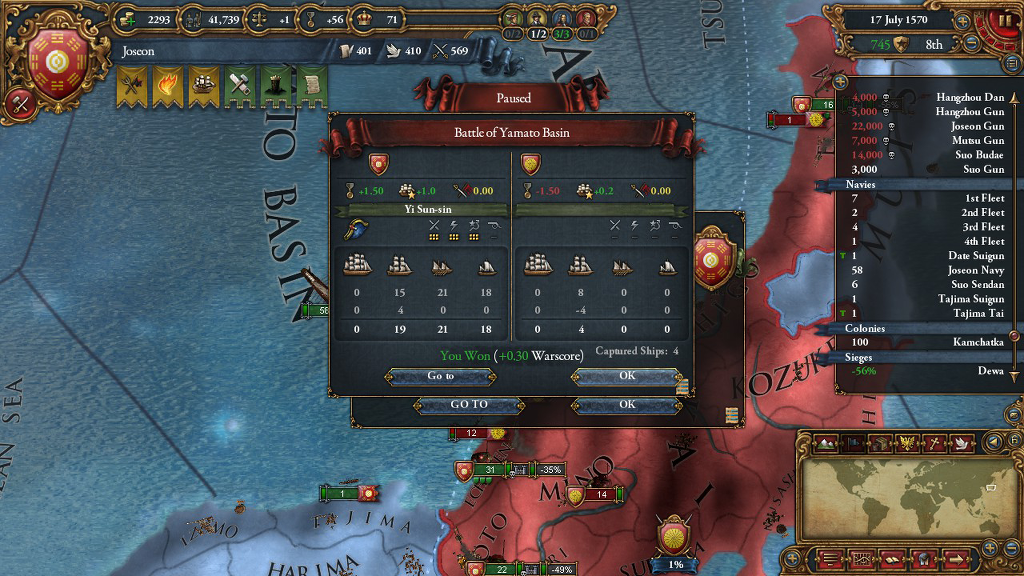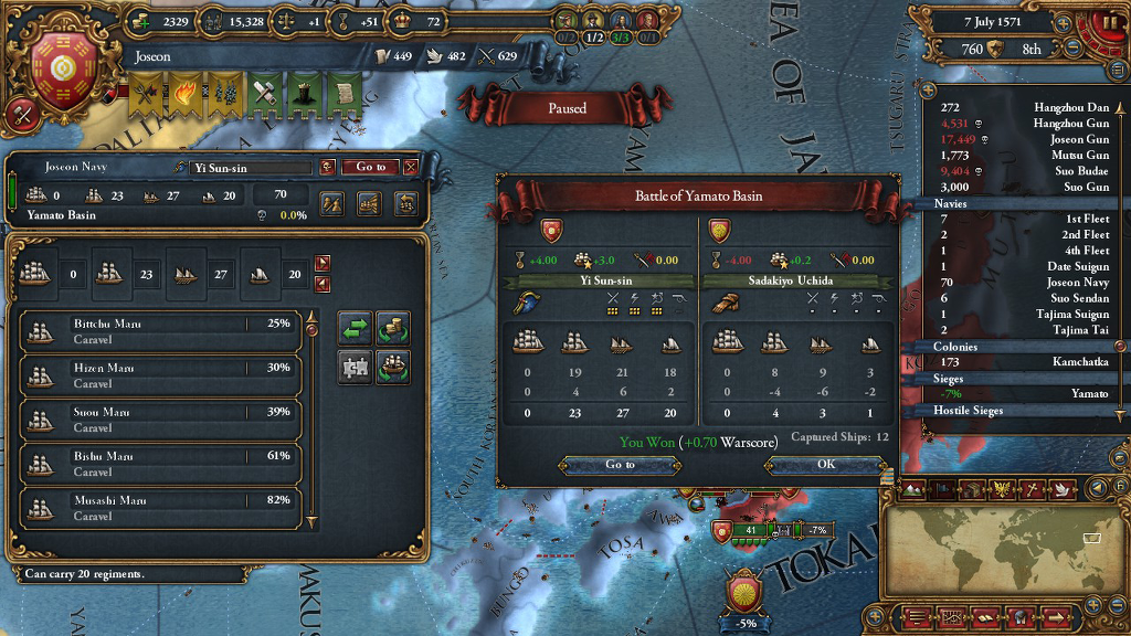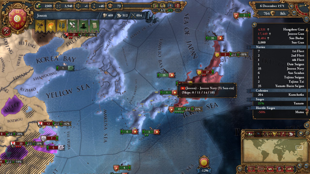 이것 뿐만이 아니라 전투 할 때 마다 일본 배들을 모조리 무상 구매 해 오시니 조선은 전쟁 시작하고 나서 배 한척 뽑은 적이 없는데 순식간에 해군 병력 숫자가 국가 한계치를 열댓척씩 넘어서고 그러더라고요 ㅋㅋㅋㅋㅋㅋㅋㅋ 사실 이순신이 해군 제독 되고나서 격침시킨 배는 한 척도 없는데, 그게 다 무상 구매 탓에 그렇습니다.