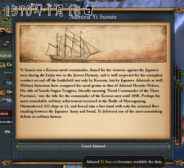 임진전쟁 이야기를 하고 있다보니 이순신이 등장합니다. Horai에서 이벤트를 통해서 등장하는 역사적 장수는 두 명인데요, 명의 육군 장수 위안충환(袁崇煥)과 조선의 해군 제독 이순신(李舜臣)의 두 사람입니다. 이 두 사람은 모두 기존 EU4에서 역사적 시간대에 맞게 시작하면 역사적 장군으로 등장하는 인물들이죠.
