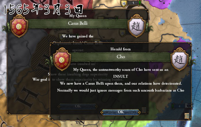 연대기 시작하자마자 조나라가 외교적 모욕을 걸어옵니다. 저거 걸어봐야 우호도만 깎이고 저에게 전쟁 명분을 조공하는데 왜 하는지 모르겠네요. 외교적 모욕을 한다고 하는 쪽에서 명분이 생기는 것도 아닐뿐더러, 지금 조나라보다 조선이 국력이 몇 배는 더 강한데 말입니다.