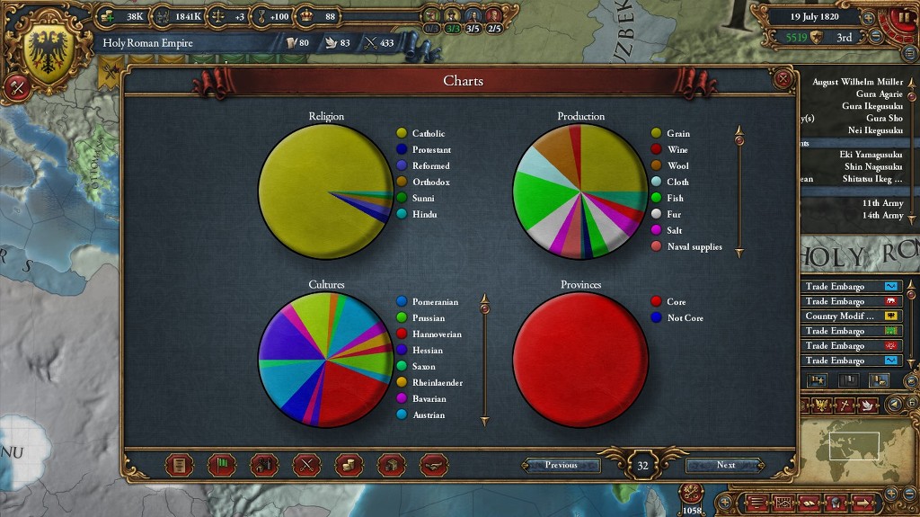 세이브로드 노가다 덕분인지 큰 나라의 대부분은 퍼유. 나머지는 속국화 뒤 영토 찾아주고 합병. 물론 그냥 쳐서 코어박은 것도 있긴하지만 오버익스텐션이 귀찮은 관계로 그런 전쟁은 대부분 신롬완성 뒤. 그러고보니 전쟁은 초반이 좀 많았군요. 그 뒤 운좋게 좋은 동맹국을 만나 애들 때리면서 해방, 속국, 합병 루트가다가 퍼유 가능이라고 뜬 큰 애들은 전부 퍼유. 큰애들만. 아 물론 저보단 작죠. 북아메리카와 중앙부터 잉카까진 독점했으니.