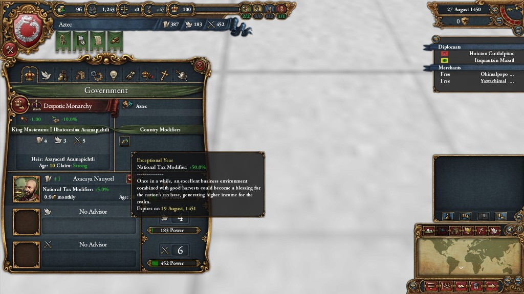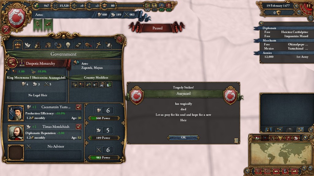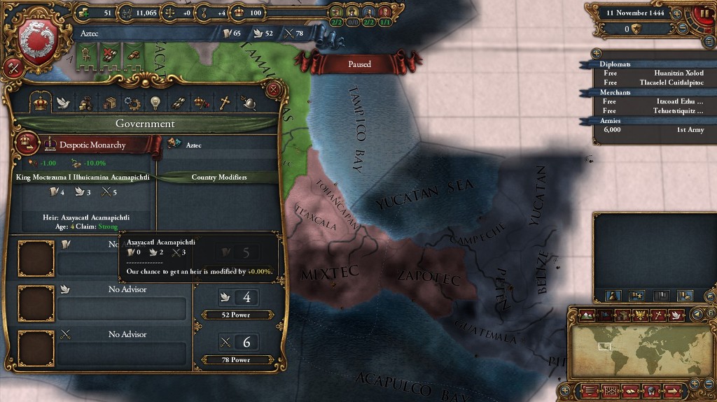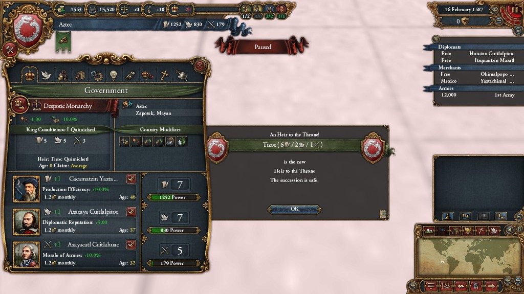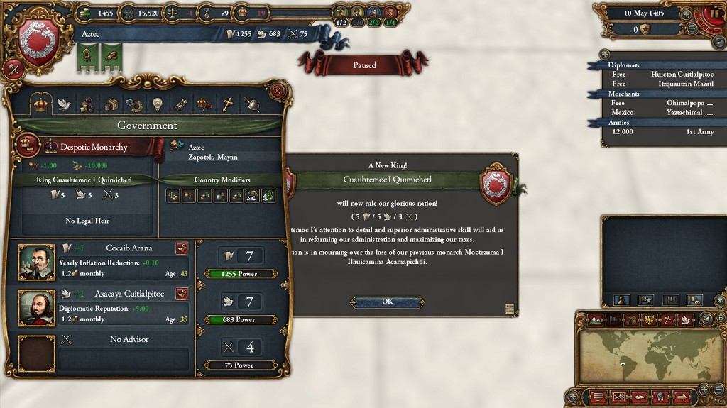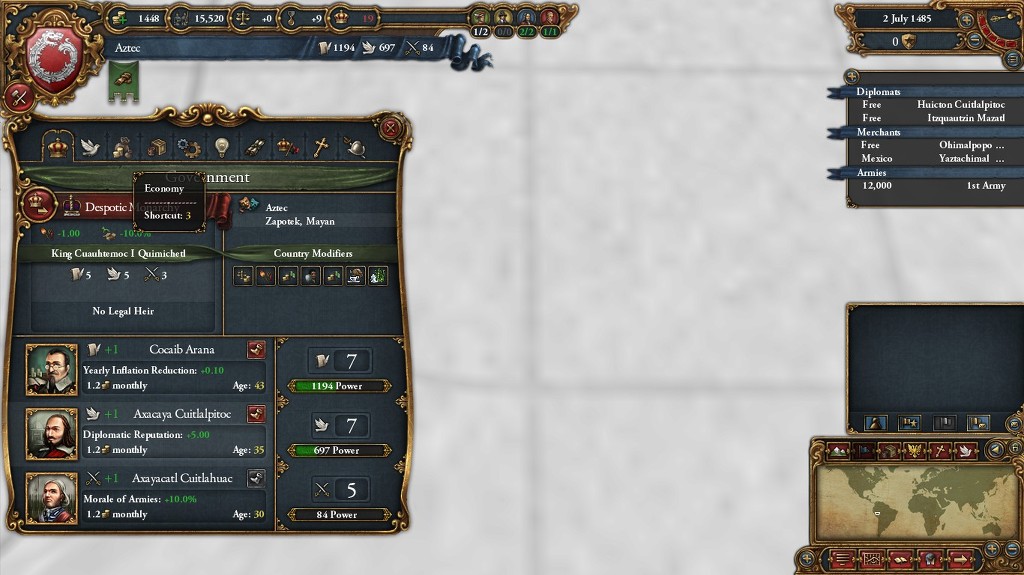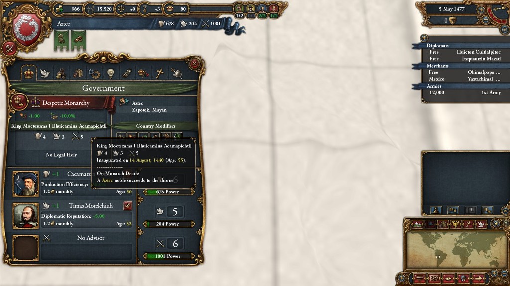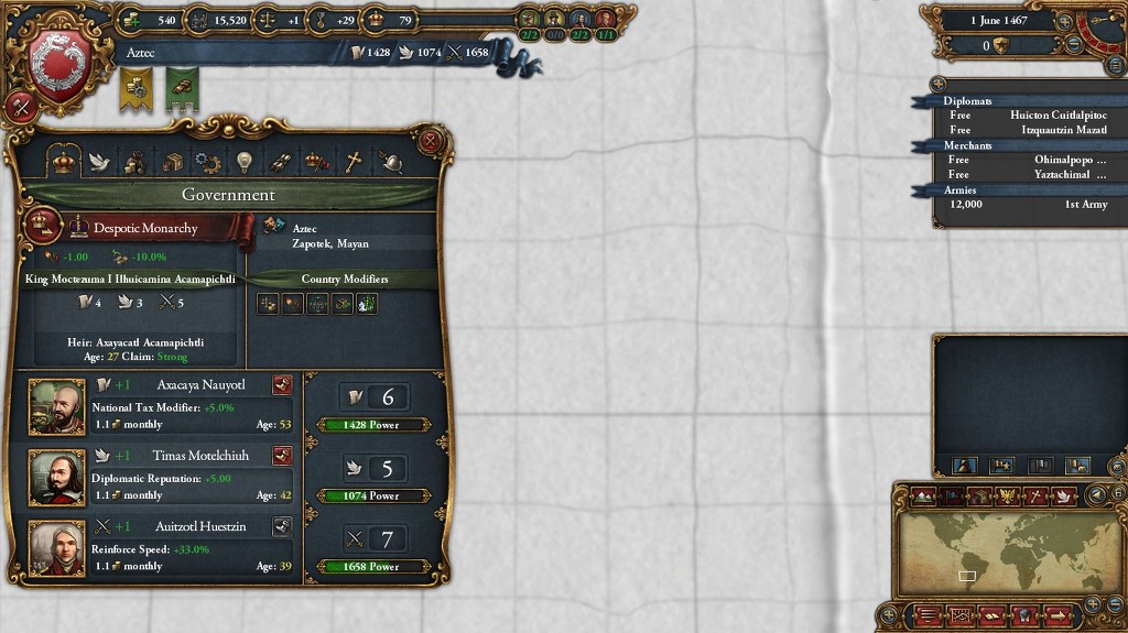 초기 아즈텍 왕정 상황. 후계자가 참으로 암울. 현 왕인 그 유명한 몬테수마1세의 능력치는 좋은 편. 멕시코 고원의 패자이자 문X 5인가 X명 5에서 이웃으로 삼고싶지 않은 문명 best에 속할정도의 인물 답습니다. 그에 비하면 저 후계자놈은......