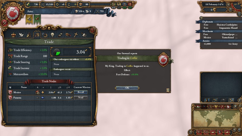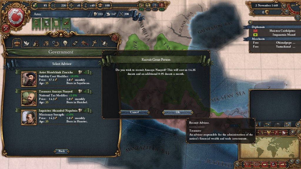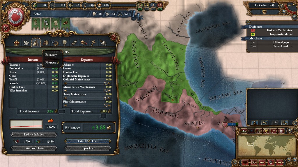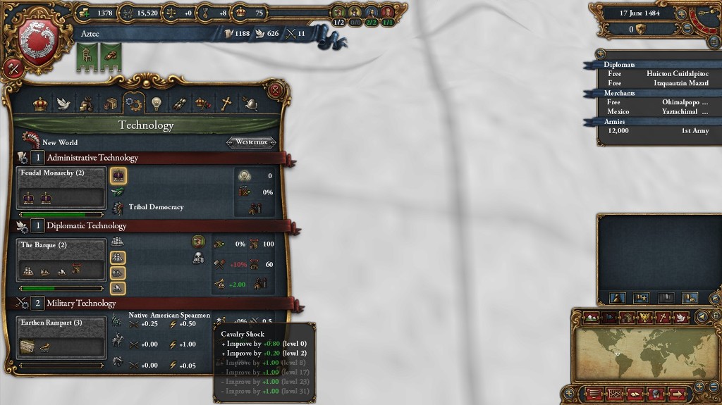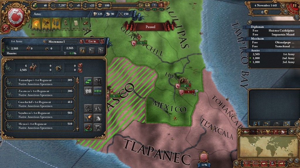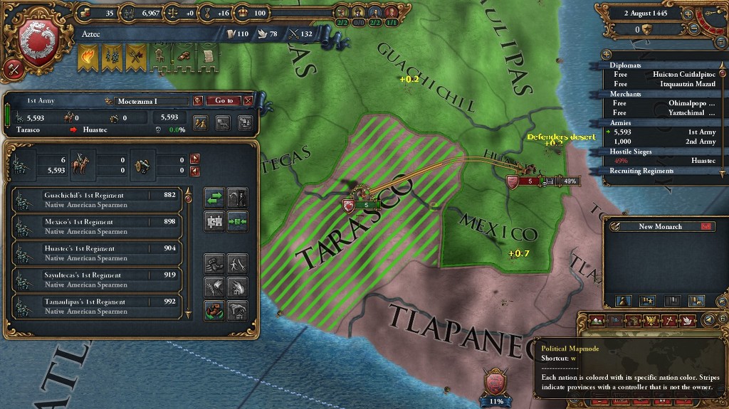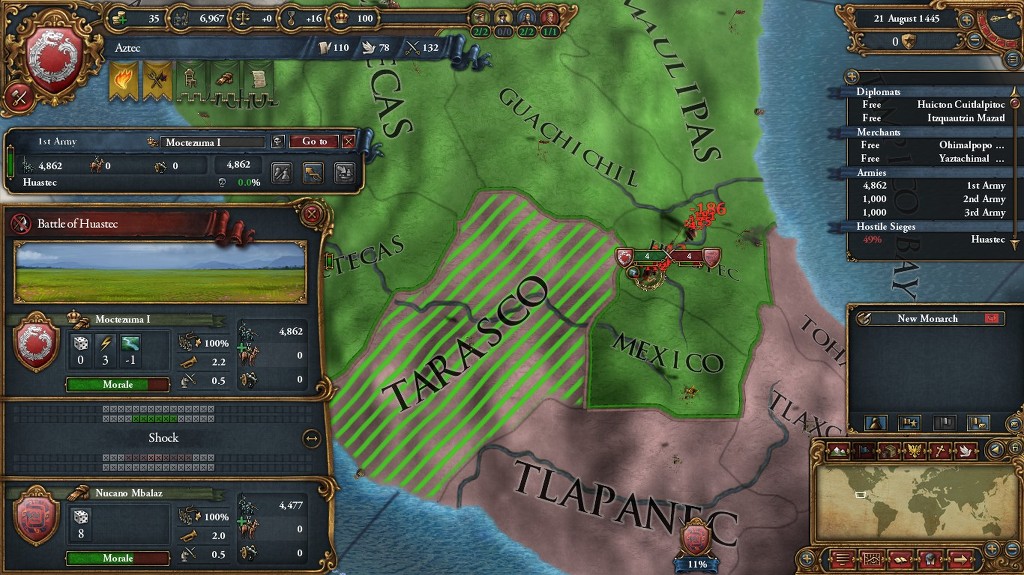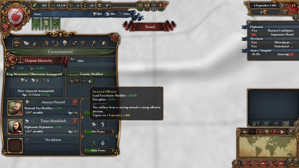 초기 아즈텍 왕정 상황. 후계자가 참으로 암울. 현 왕인 그 유명한 몬테수마1세의 능력치는 좋은 편. 멕시코 고원의 패자이자 문X 5인가 X명 5에서 이웃으로 삼고싶지 않은 문명 best에 속할정도의 인물 답습니다. 그에 비하면 저 후계자놈은......