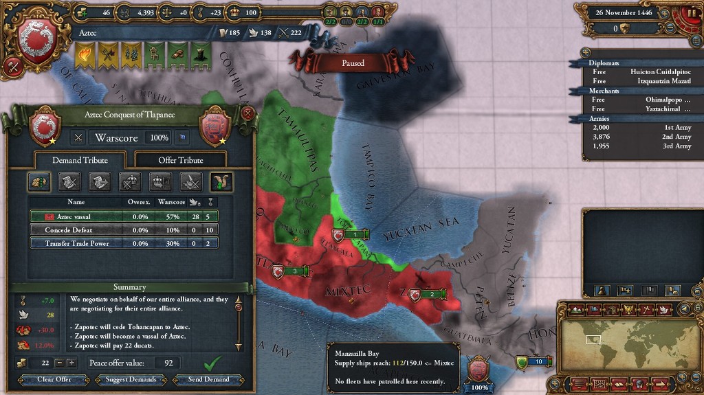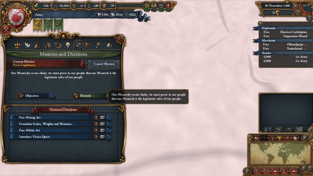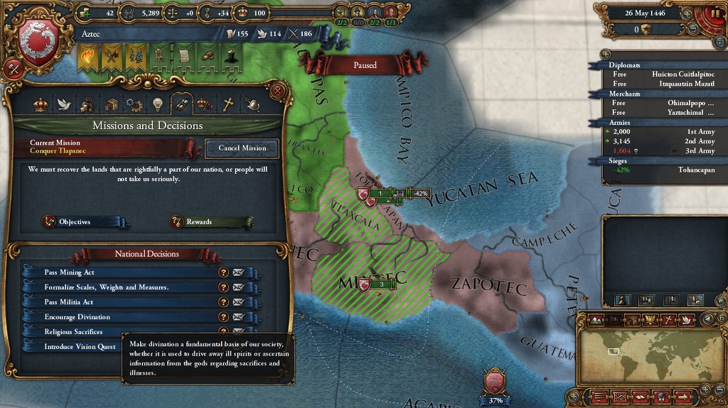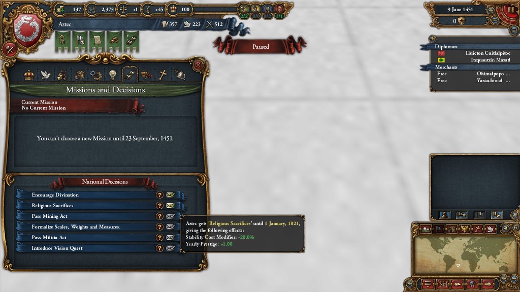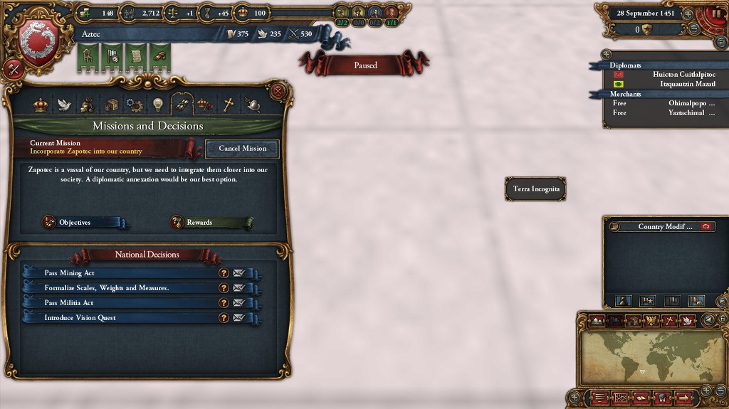 사포텍 속국 전에 받아두었던 미션은 포기한 관계로 1451년까진 미션 없음. 뭐 곧 끝나겠지만.
