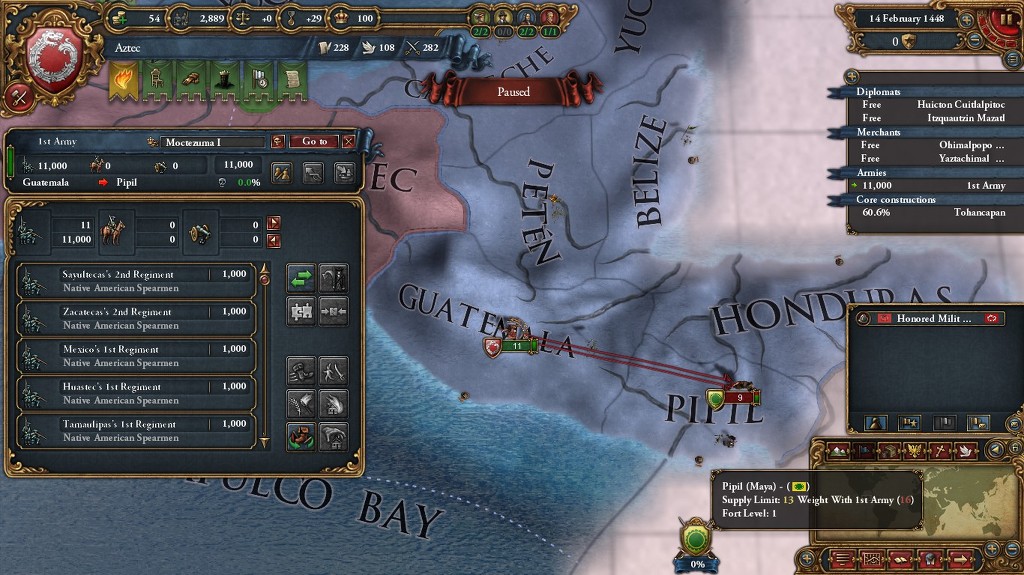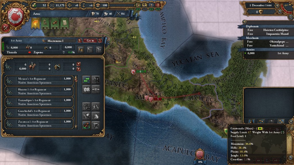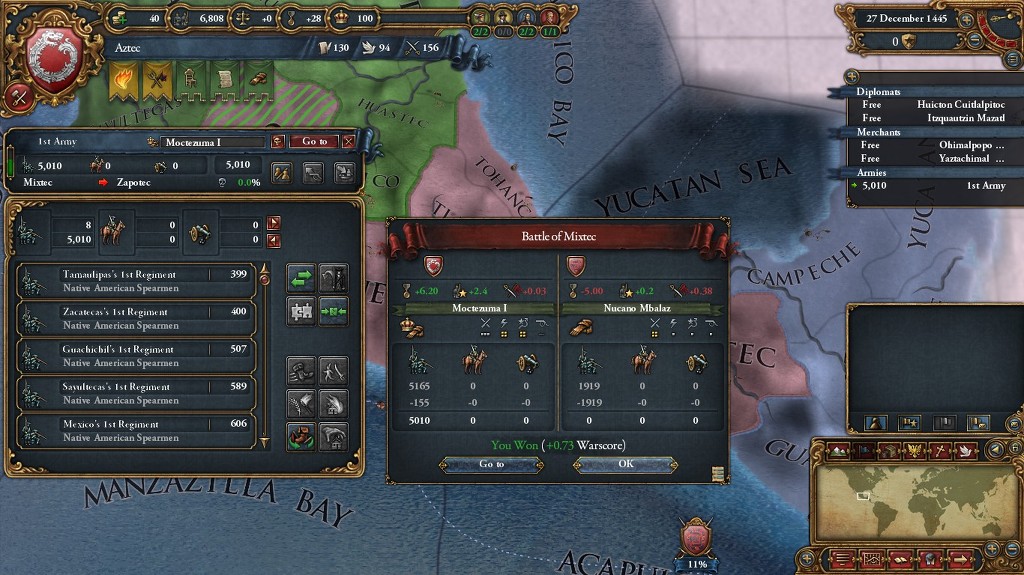 보면 알겠지만 몬테수마 형님의 장군으로써의 능력치는 초반치고는 상당한 편. 그에 비하면 사포텍은 50포인트로 고용해야 쓸만한거 나올까 말까겠지. 참고로 저거 5부대 이미 본대 하나 바르고 새로 나온 애들입니다.