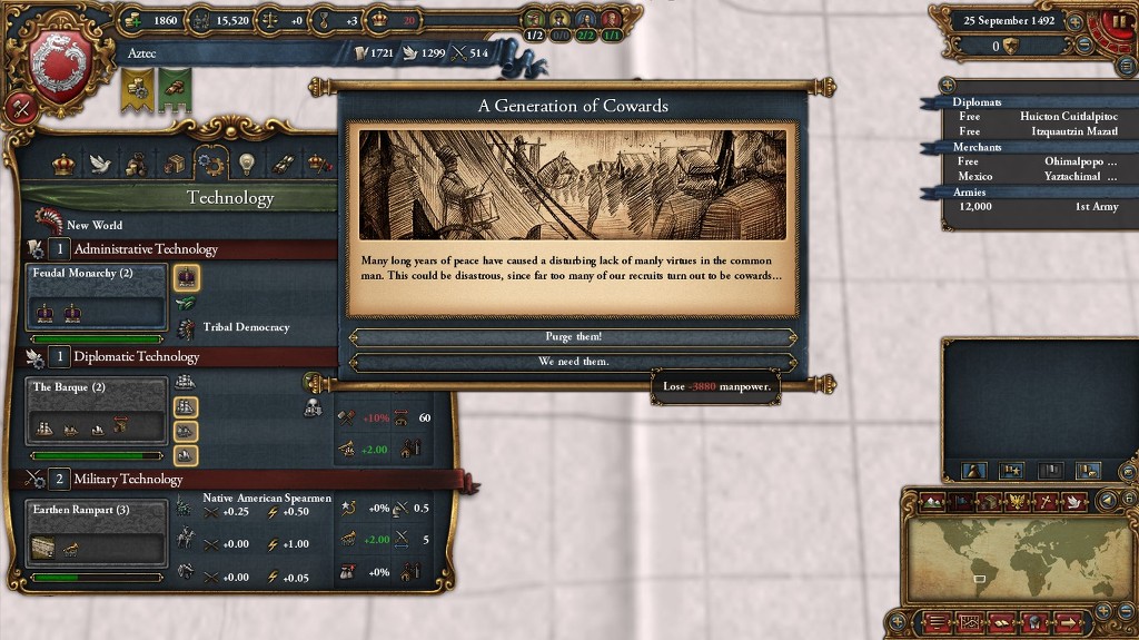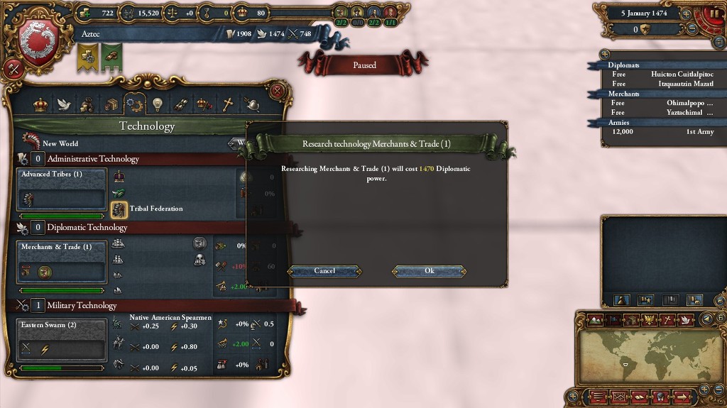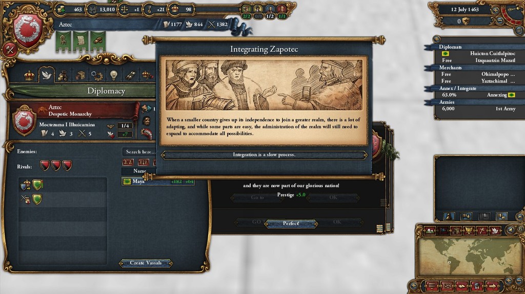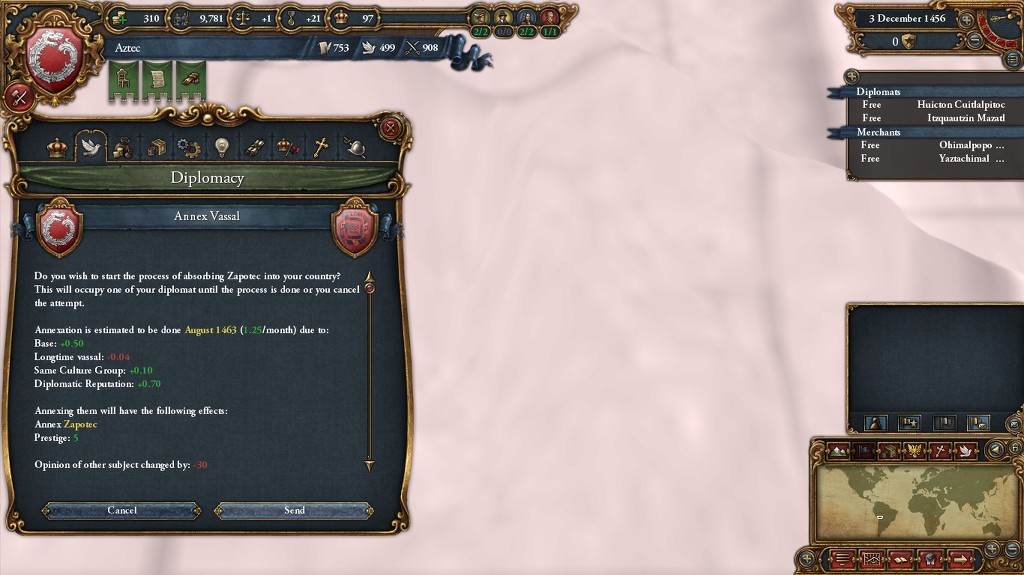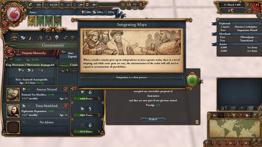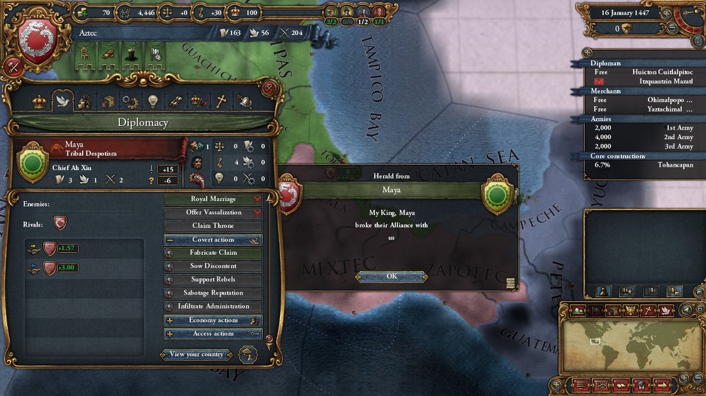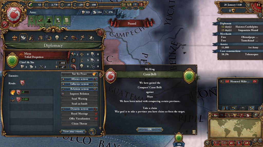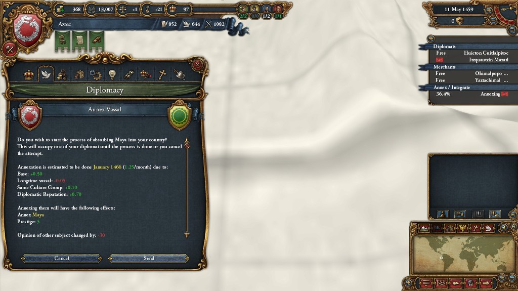 마야 합병 시작과 사포텍과 마야의 합병 성공. 참고로 안밝혀진 곳에다 화면을 두는 이유는 조금이라도 빠르게 진행하기 위해서 입니다. 류큐처럼 배째고 나와서 인터넷봐도 되는 국가와는 다르거든요. 아즈텍은 지속적인 관심이 필요해요.