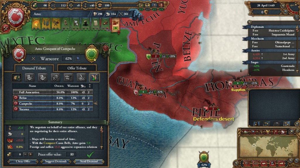 이로써 마야도 아즈텍의 속국. 여러모로 초반엔 속국이 편하죠. 포인트 덜 들고 반란 위험성도 없고. 물론 후반에도 편하긴 하지만요. 어찌 되었든 직접 전쟁에 장군으로 참여하신 몬테수마 형님의 위엄을 따를 자는 사포텍에도 마야에도 없습니다.
