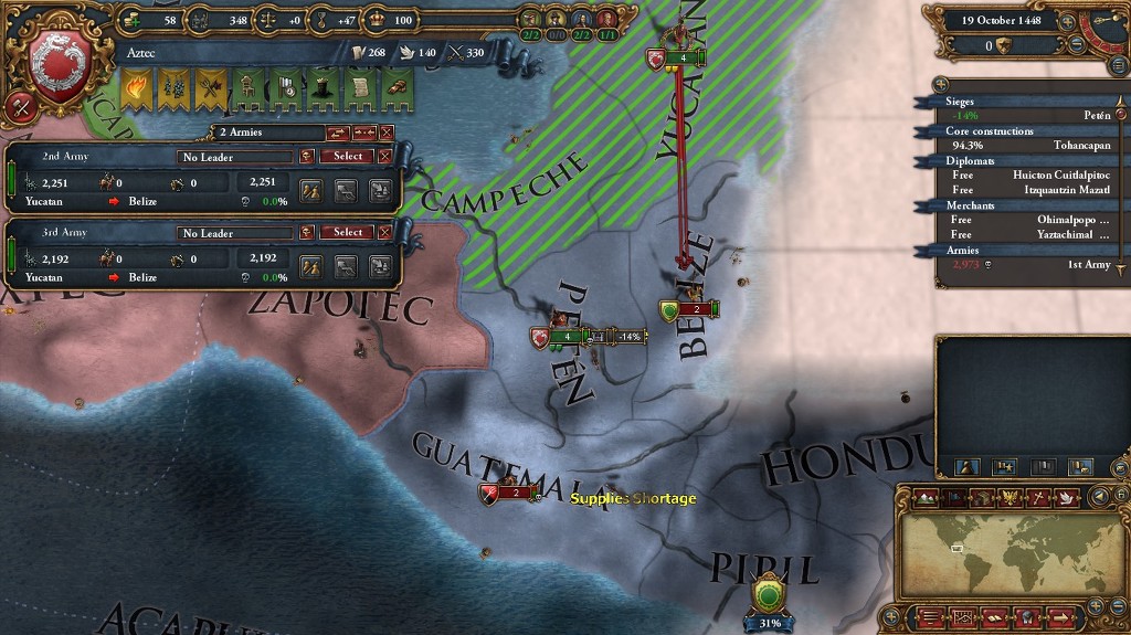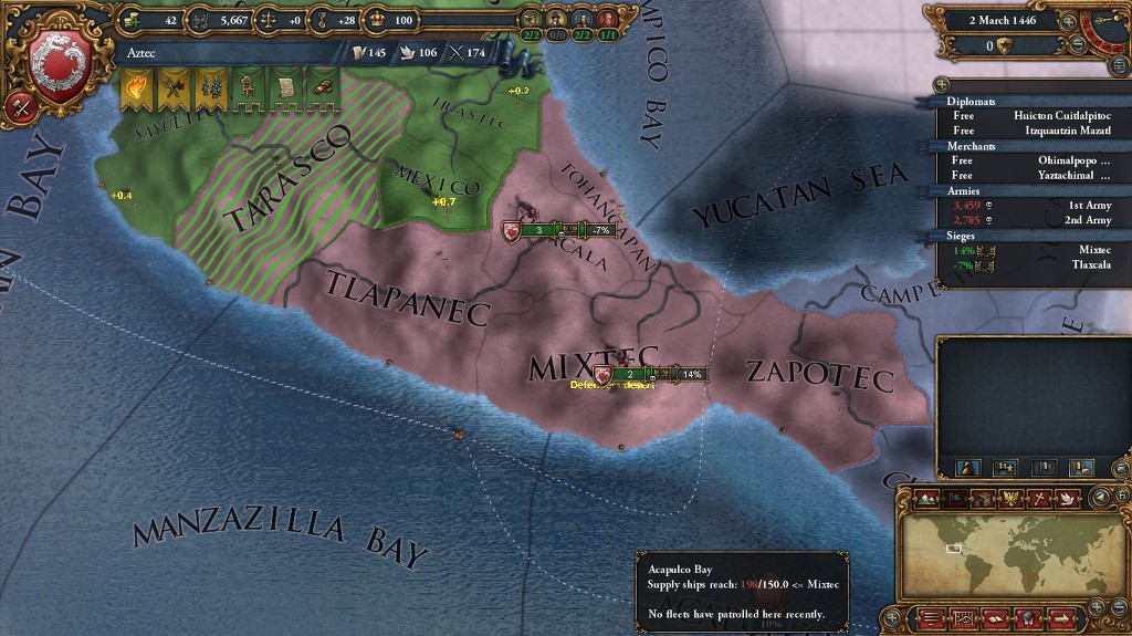받은 미션은 저기(라고 해봤자 가려져서 안보이는) 멕시코 바로 아래 해안프로빈스를 먹으라는 거지만 전 편의를 위해 마야와의 사이에 있는 해안 프로빈스를 먹을 예정.