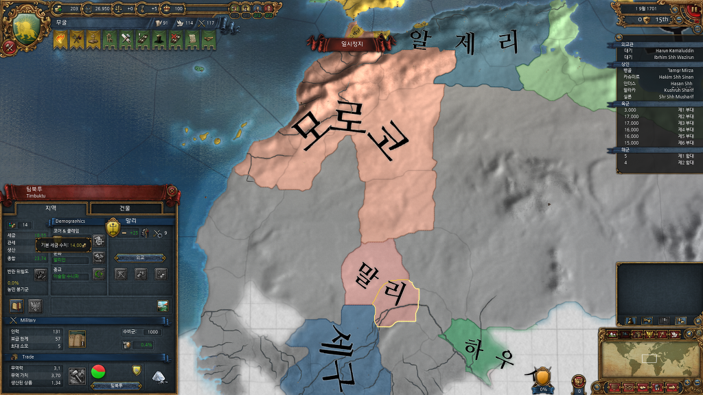 ㅋㅋㅋㅋ 모로코로 한다면 탐헌관련 아이디어 빨리찍고 팀북투지역까지 다가간 후 말리 팬후에 팀북투를 빼앗고 수도이전하세요!!!