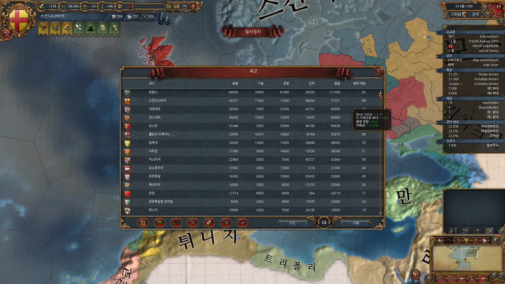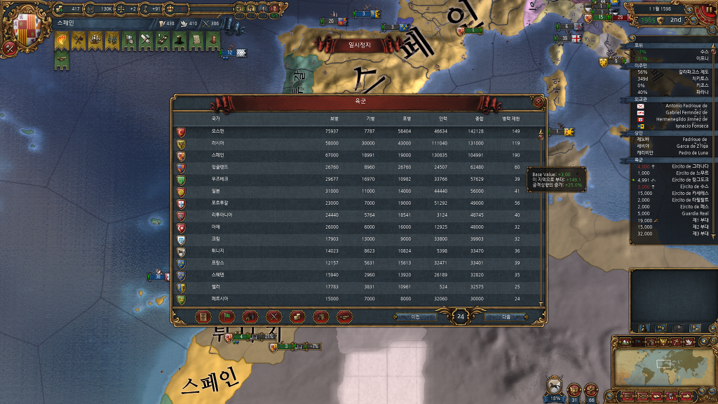저게 지금 프랑스 + 모스코바랑 양면전쟁 하면서 계속 확인하는 것이라 프랑스를 저 지경으로 만든 상태에서도 인력 10만이 넘고 돈은 11k입니다.