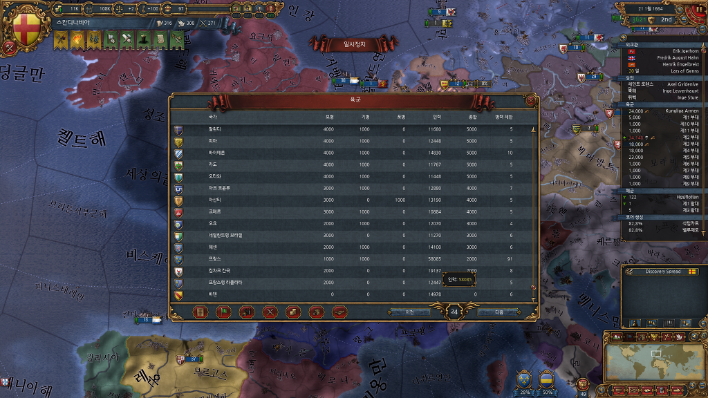 반대로 스칸디나비아 식민지는 아무것도 없는 무관심 세상인데, 돈이 쌓여나가고 인력도 9만대로 식민 대제국인 스페인과 비교해서 그렇게 차이가 안납니다.