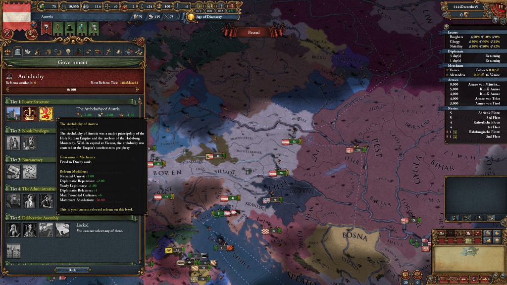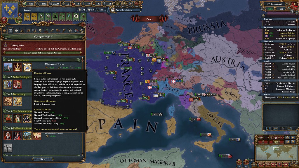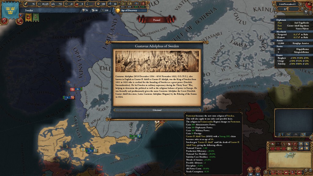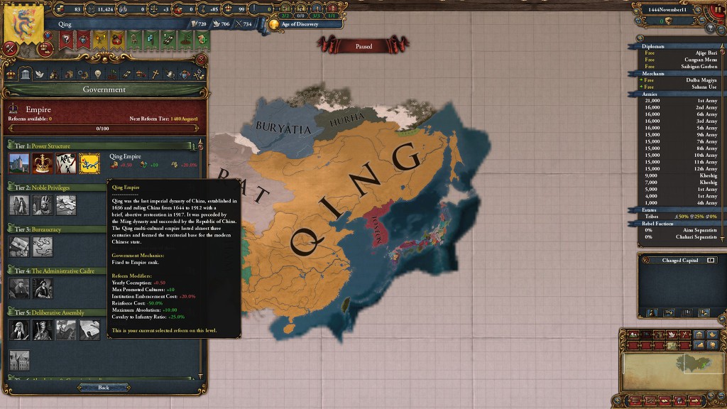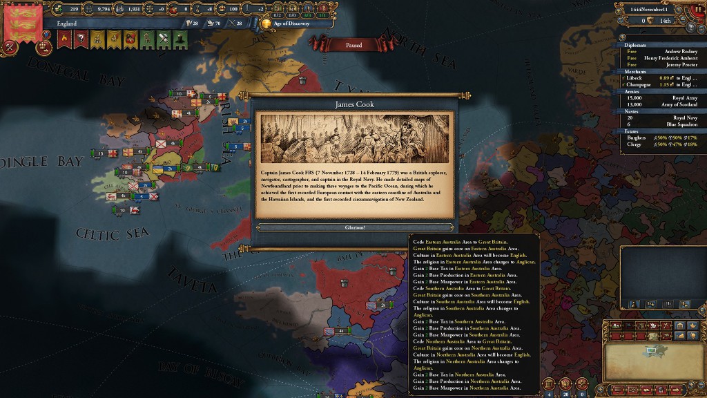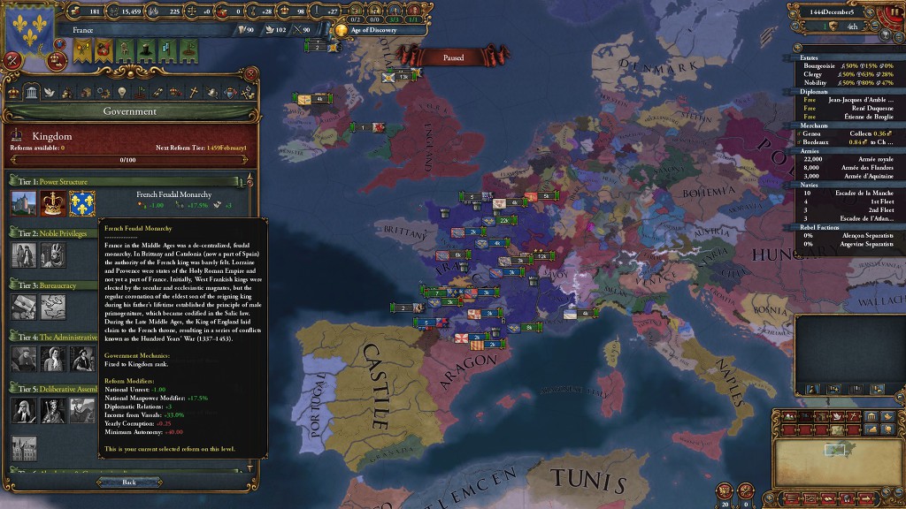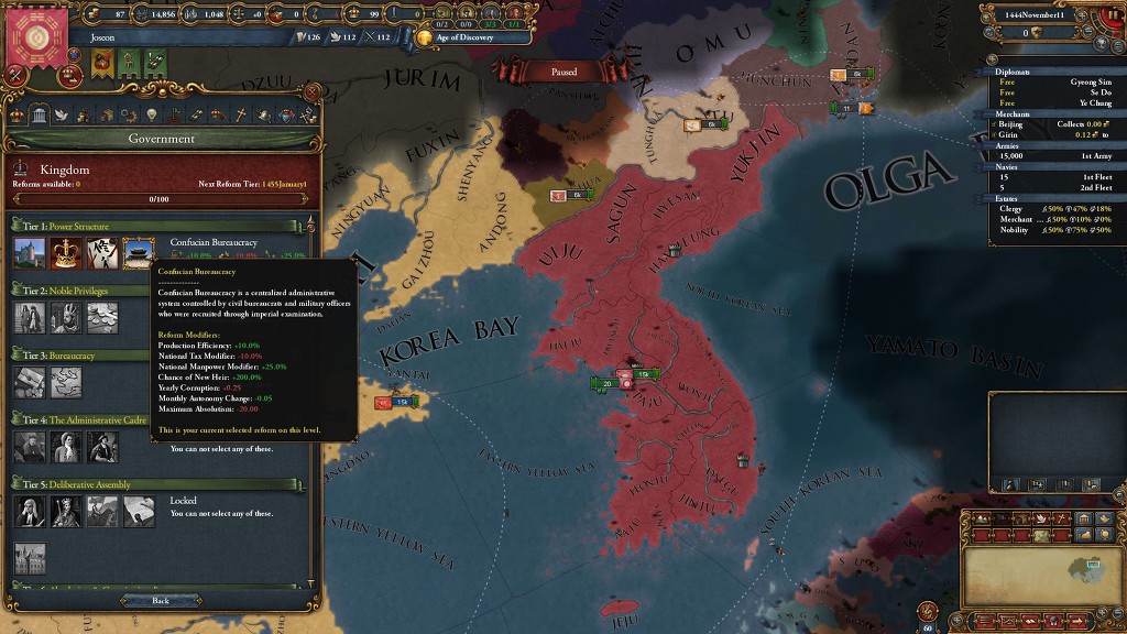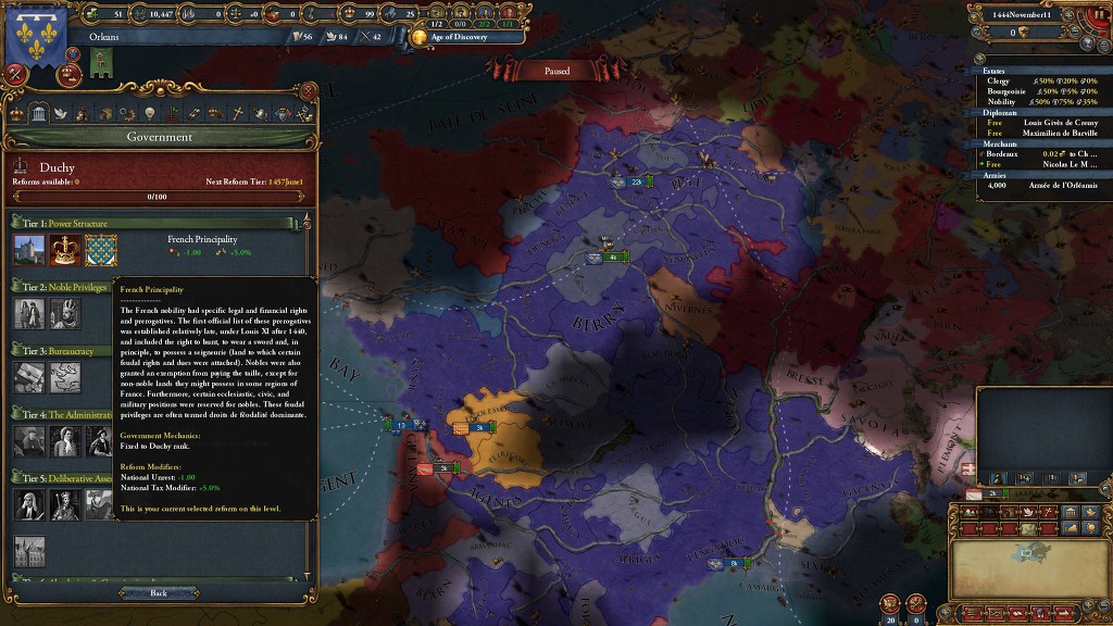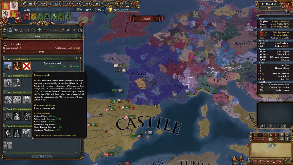 1) 발견의 시대 시기 : 세금/생산/무역 5% 증가, 인력회복속도 25% 증가, 육군 유지비 10%감소, 육군 소모 20%감소
