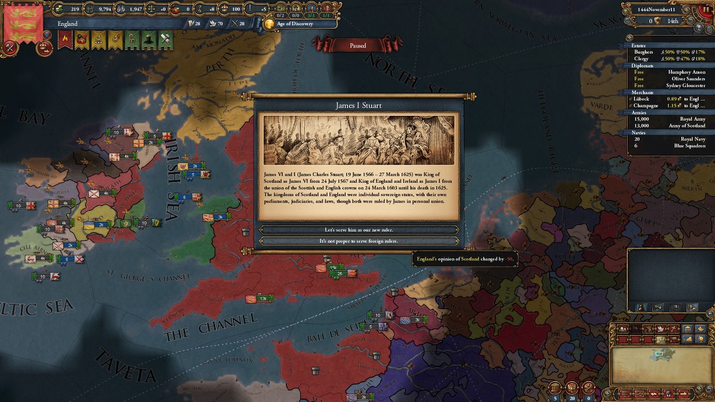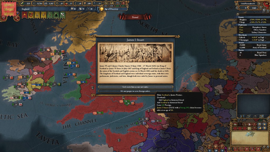 조건 : 1603~1625년 사이, 지도자가 여자가 아니고 후계자가 없을 것. 성공회이면서, 스코틀랜드가 속국이 아니고 유저가 아니어야합니다.