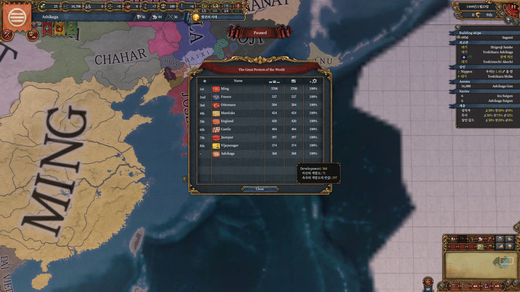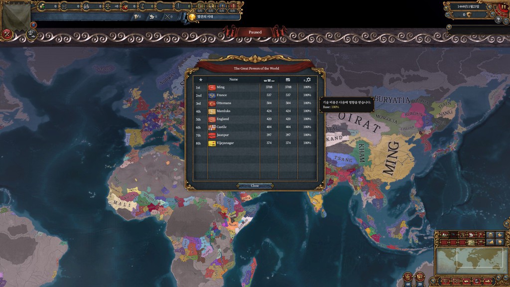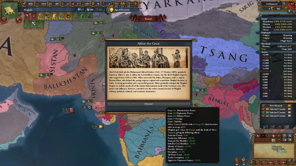 1556~1605년 사이 무굴제국이면 등극합니다. 위와같은 사기적인 군주와 사기적인 지도자 보너스를 받습니다. 악바르 대제 시기에 최대한 확장하고, 마찬가지로 AI가 무굴일경우 마찰을 피하던가 필사적으로 견제해야합니다.