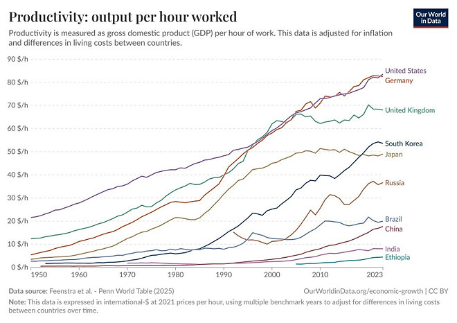 Penn World Table (PWT): 그래프 하단에 적힌 'Feenstra et al. (2025)'은 경제학계에서 매우 유명한 로버트 핀스트라(Robert Feenstra) 교수팀을 의미합니다. PWT는 미국 UC 데이비스와 네덜란드 흐로닝언 대학교가 공동 관리하는 데이터베이스로, 국가 간 실질 소득과 생산성을 비교할 때 글로벌 표준으로 통합니다.