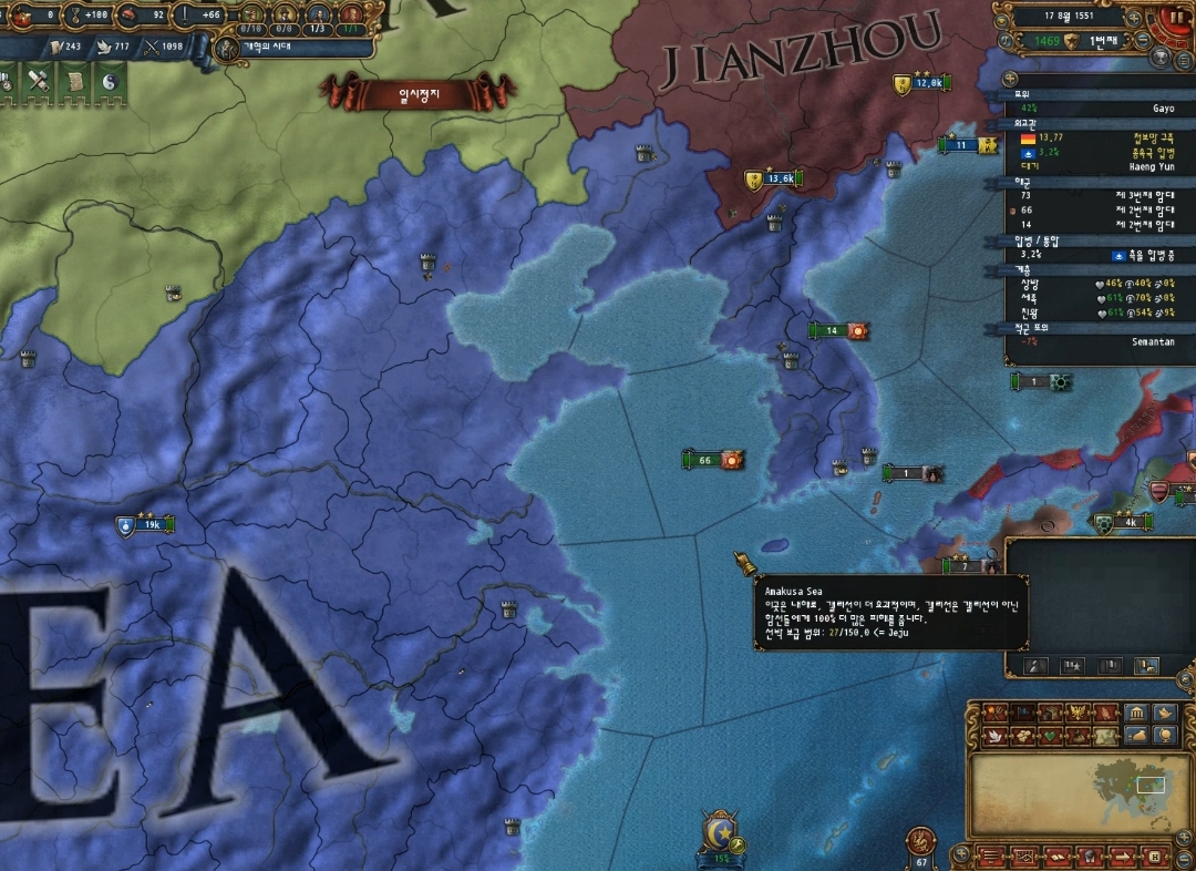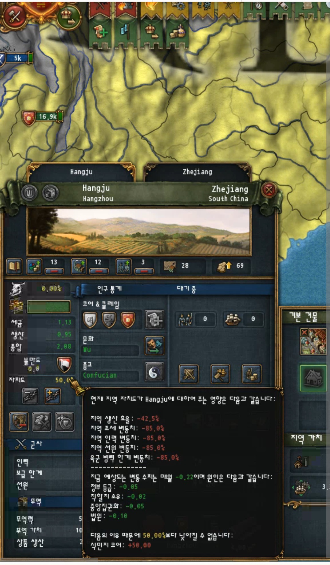 3. 주의사당 가능지역을 주로 전환한다고 항저우 쪽에 주 선포하고 코어 박으니 자치도 50% 식민지 코어로 생성 되네요.