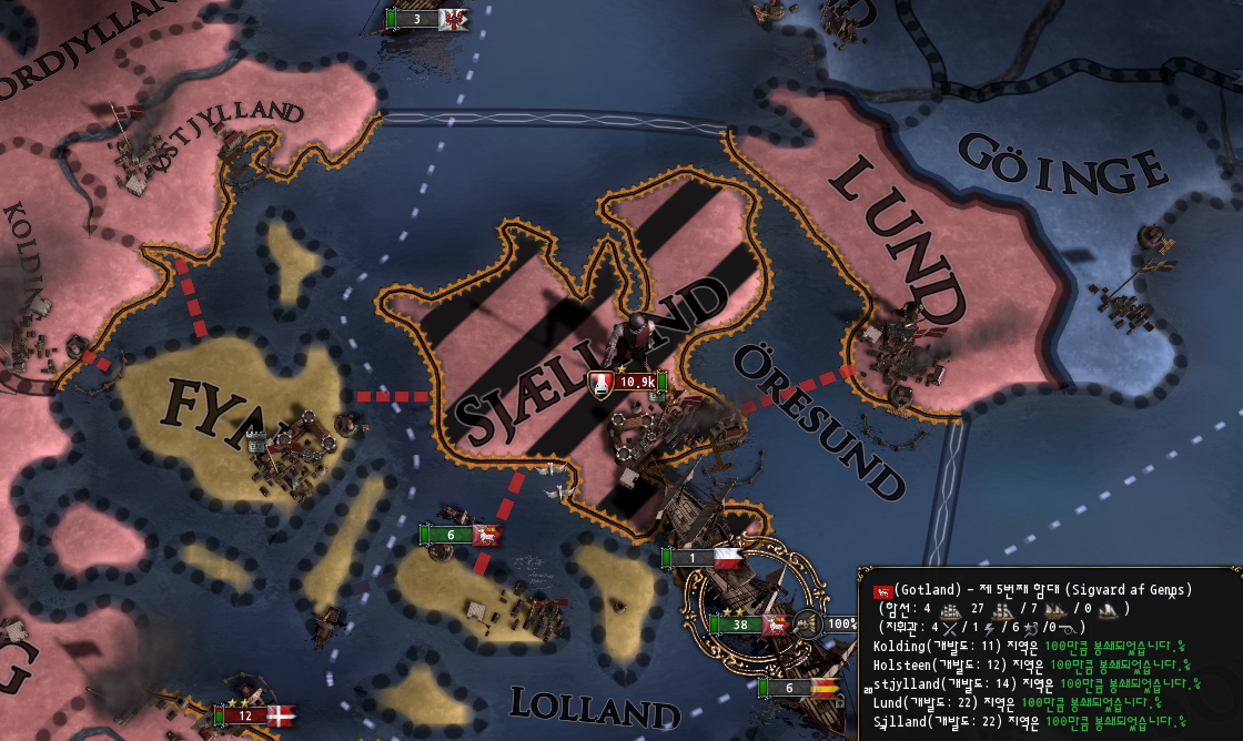 작성자Cambrai 작성시간 25.01.01 양쪽 땅을 모두 통제하고 있으면 적국이 봉쇄해도 건너갈 수 있습니다. 그림과 같은 상황에서는 덴마크가 한쪽만 통제하고 있기 때문에 덴마크군이 건너갈 수 없습니다. 반군 역시 모든 나라의 적국으로 취급되기 때문에 봉쇄 효과가 적용되어 건너갈 수 없습니다