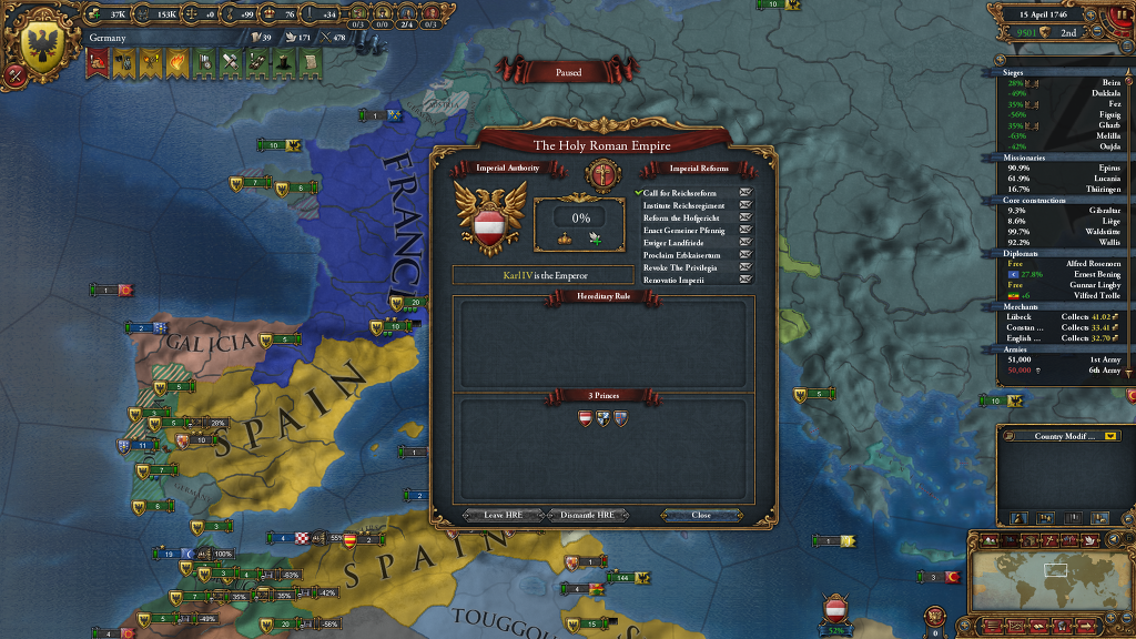 그래서 빈을 점령하고 Dismantle HRE에 마우스를 올렸더니 ... 'You cannot dismantle HRE once it became hereditary'라는군요 ... (그게 뜨게 찍었어야 했는데 스샷을 잘못찍었네요..)