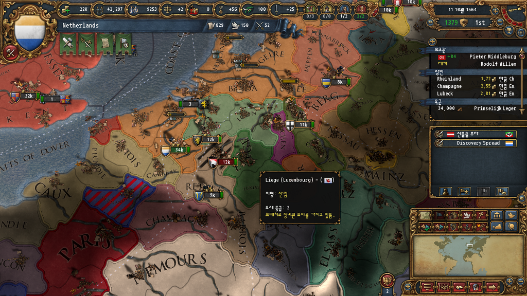 eu4wiki 출처로, 1550년에 네덜란드가 존재하고 5개 이하의 프로빈스를 지닌 주요 문화권 flemish의 브라반트는 연방에 가입해야 하지 않나요. 한 10년째 전쟁 없는데 어째 가입할 생각이 없어보이네요...