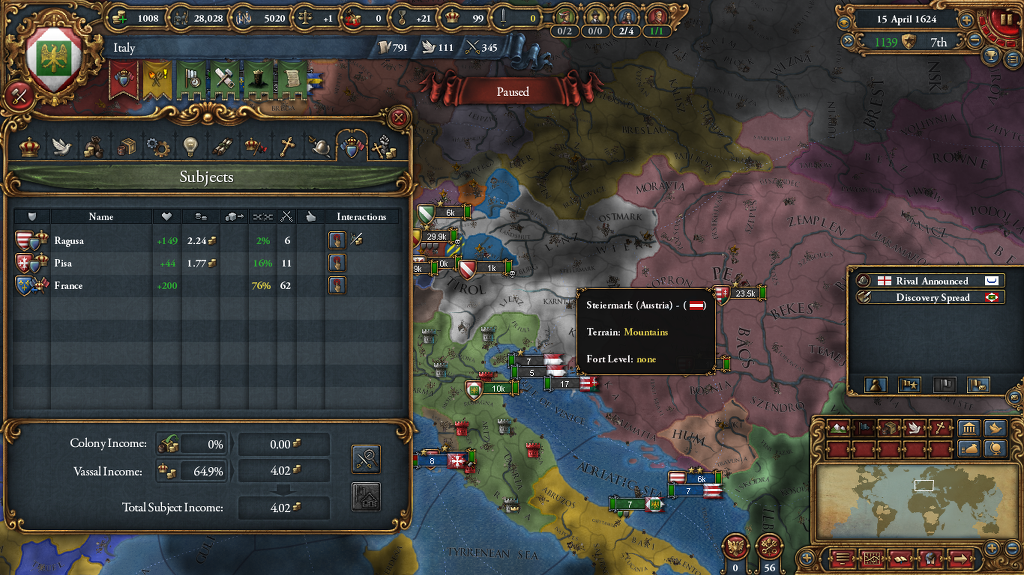 또 속국으로 땅 2칸짜리 피사랑 한칸짜리 라구사를 보유 중인데 흡수하는게 더 나을까요?(다만 피사는 주교령이고 전 파문 당해서 당분간 흡수 불가...)