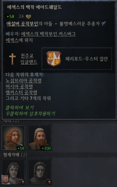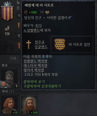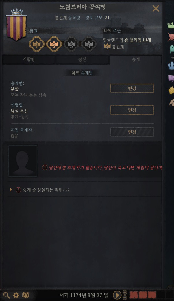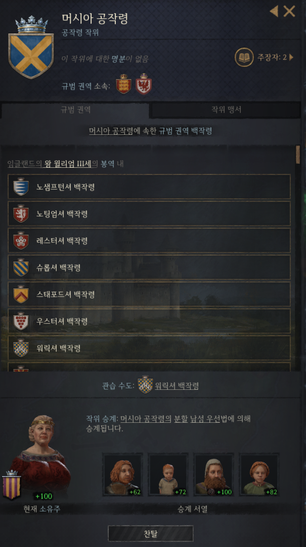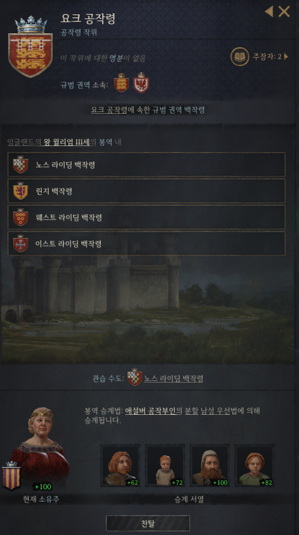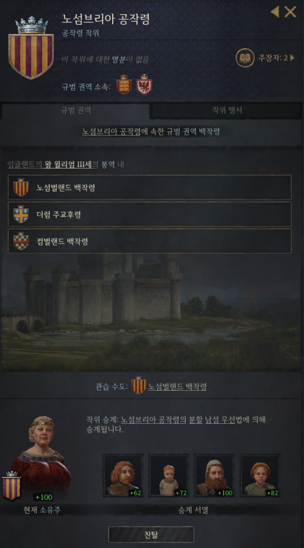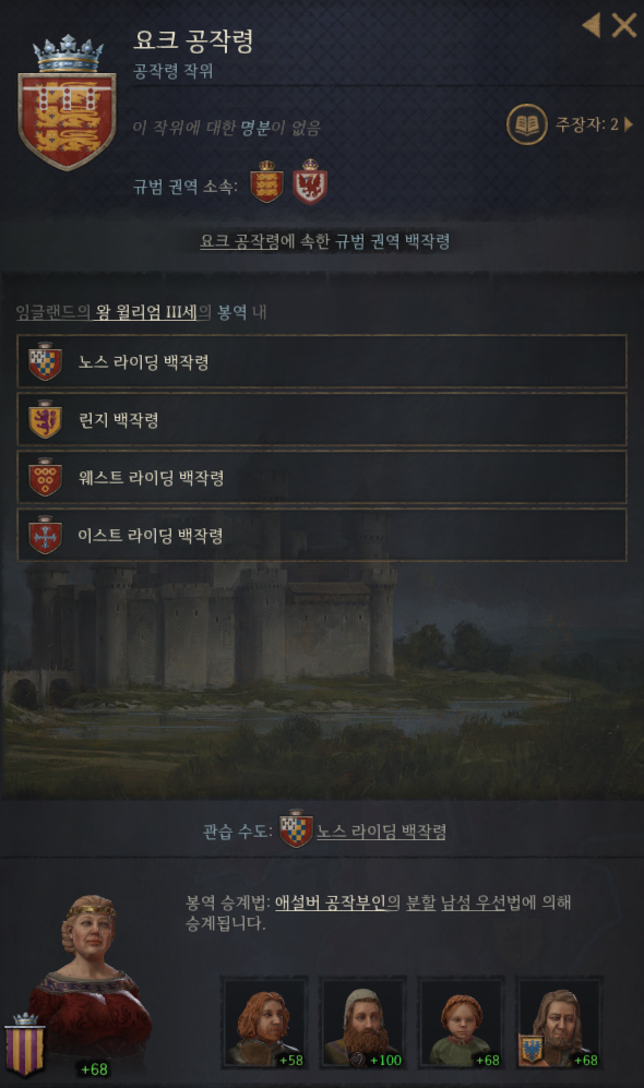 아들은 2명이고 남성 우선법이 적용되니 이 경우 제가 생각하기엔 대표공작령인 노섬브리아와 또다른 공작령 1개를 가져가고 둘째 아들은 나머지 두개의 공작령을 물려받아여 균등분할인게 아닌가 싶은데...