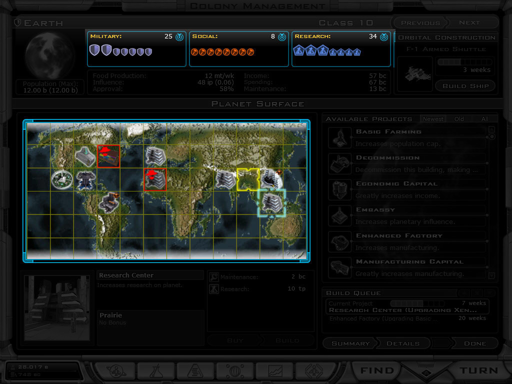 예를들어 원래 행성의 생산할 수 있는 양이 100%라면 연구33% 생산33% 식량 33%로 균등분배가 되어있지만 연구중심 행성으로 설정할 경우 나머지 비율을 줄이고 연구능력만 50%정도로 뻥튀기시킬 수 있도록 되어있습니다.