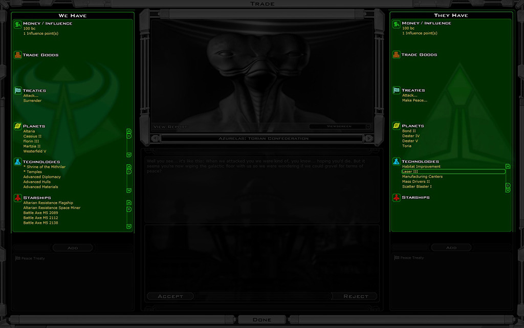 예를들어 하이퍼 드라이브 1만 가지고 있는데 다른 제국에서 3을 살 수 있다던가 에너지무기만 쓰는 컨셉일 경우 역설계로 키네틱무기를 얻고 다른제국에 기술을 파는등의 플레이가 가능해졌으면 좋겠네요. 그리고 함선도 매매가 가능합니다.