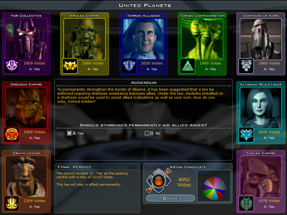 갤2에는 항성계 폭파 무기가 있는데 이런걸 사용가능, 불가하도록 투표로 결정한다던지 우주 스테이션의 특수기능을 사용못하게 하는것도 투표로 결정할 수 있습니다.