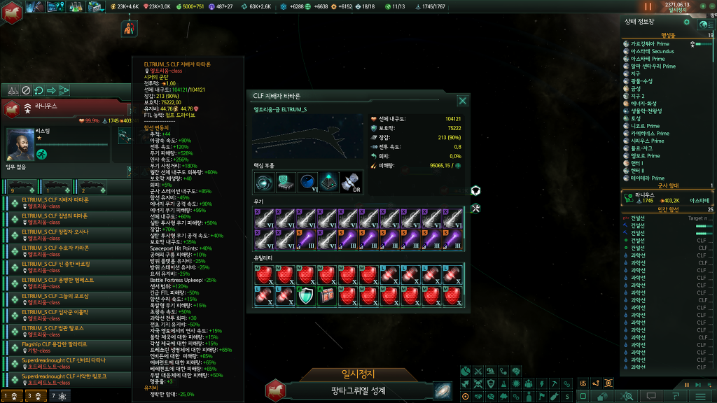 엘트리움에 달린 모듈이 무기피해량, 연사속도를 엄청나게 올려주는데다 무기 사정거리 +150%가 붙어있어 X무기 싸움으로 가면 다른 함대가 엘트리움을 때리질 못하고 다 터집니다. Advanced Weapons 모드를 비롯해 다른 무기모드 없어도 아크이미터만 달아도 적수가 없을 것으로 보입니다.