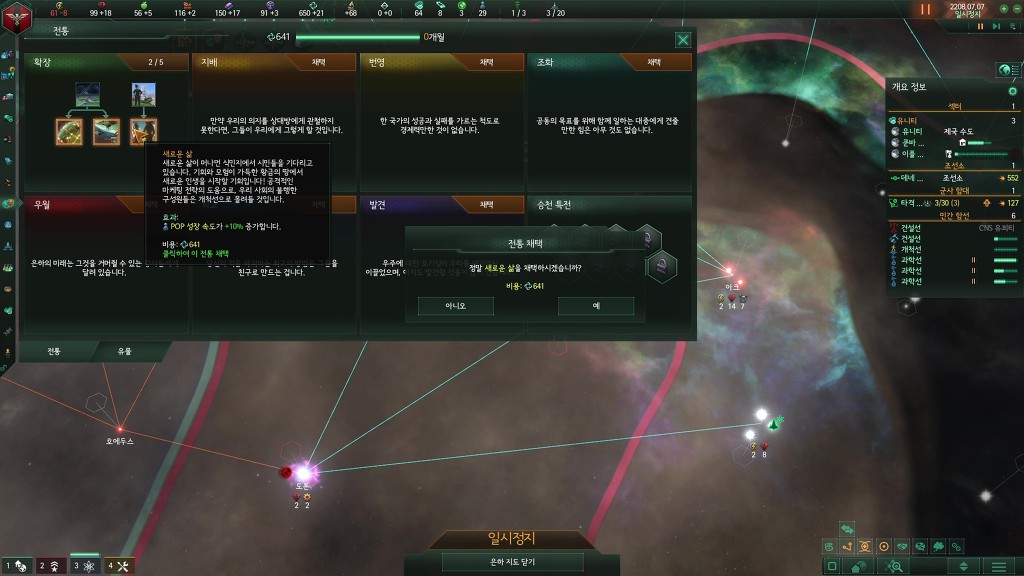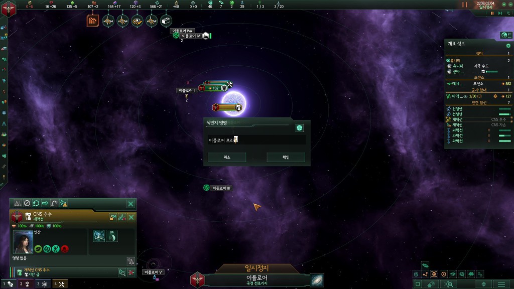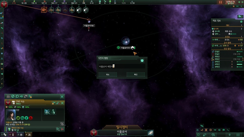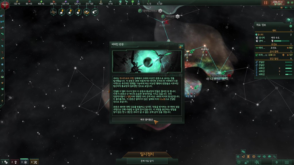 "CNS 순례자와 토니 가브리엘이 이플로어 항성계에서 거주 가능한 행성을 발견했습니다. 그것도 하나가 아니라, 무려 둘입니다! 그리고 도톤 항성계에서도 지금 당장 인류가 거주할 수 있는 것은 아니지만 확실한 거주 가능 행성이 존재하니, 당초 연방 천문학계의 예상대로 인류 연방이 위치한 은하의 중심부는 거주 가능한 행성이 다섯 개나 있는 중요한 자리였습니다.