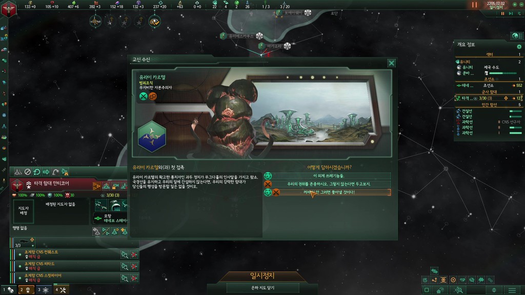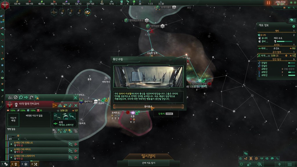 "대원수 각하. 잊고 있던 우리의 첫 번째 과학선. CNS 순례자로부터의 연락입니다. CNS 순례자가 호에두스 성계에서 정체 불명의 외계 함선과 조우했습니다. 이 함선은 우리의 과학선처럼 금속 공학 기술로 이루어진 함선이 분명하며, 지난 번 그 자의식 과잉의 외계인 놈들처럼 우리 눈에 보이기도 전에 인류 표준어로 말을 걸어오는 기행은 벌이고 있지 않습니다.