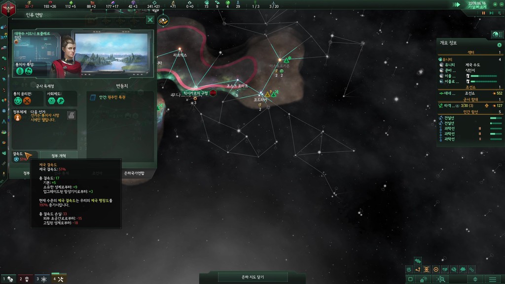"대원수 각하. 인류 연방의 행정적 효율성이 50%에 불과합니다. 두 서류를 올리면, 한 서류는 여러 관료들을 거치며 본래 처리되어야 하는 것보다 훨씬 늦게 처리된다는 것이죠. 이를 위해 인류 연방은 필요 이상으로 많은 행정적 부담을 겪고 있습니다.